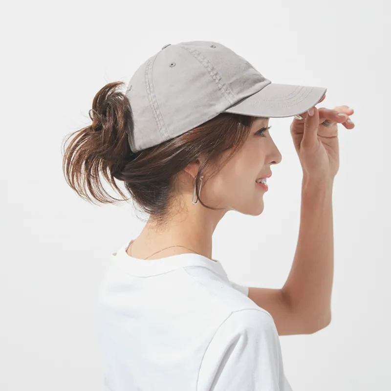 風が強く吹いても飛ばされにくく、脱いでもトップがぺしゃっとしない秘訣は、事前に仕込んだハーフアップ。お団子ハーフアップにしてからキャップをかぶり、毛束をねじってクリップで留めるだけだから簡単です。