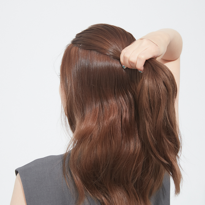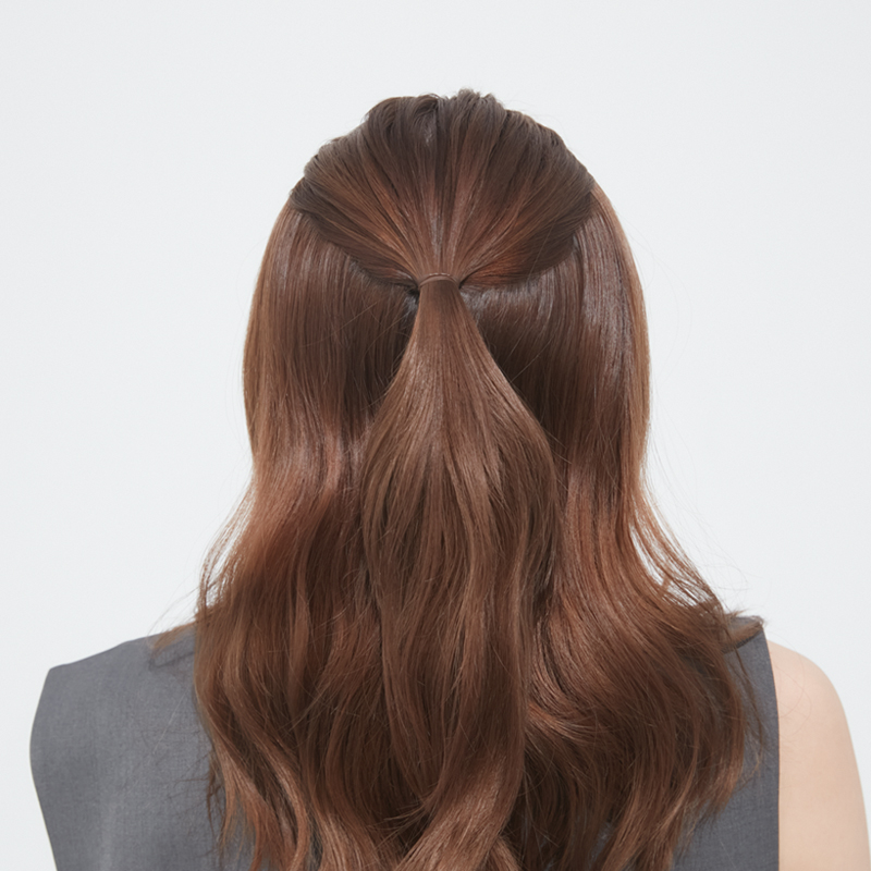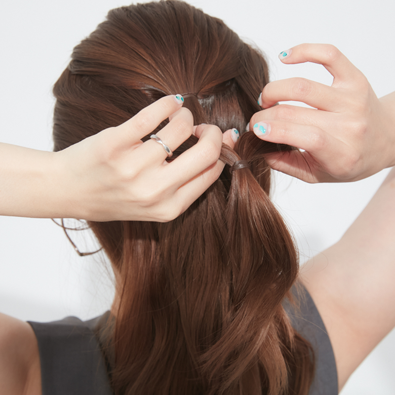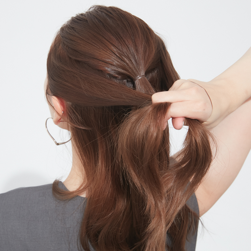 5. 最後に、ゴムを隠すようにハーフアップ部分の毛束を広げ、調整する。