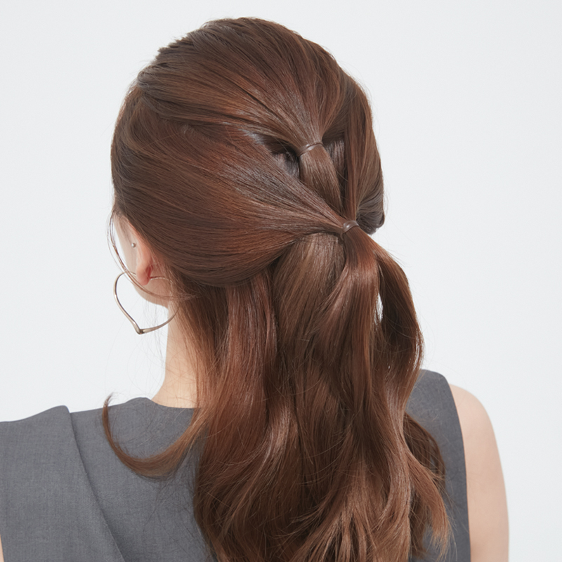 「髪が多くて広がりやすい」「寝ぐせが気になる」……。そんなときに便利なのがハーフアップ。ボリュームを抑え、顔まわりをすっきり見せます。今回紹介するのは、ヘアアクセなしでも上品に仕上がるアレンジですが、難しい編み込みテクニックやピンは不要で、使うのはゴム2本だけ。時間のない朝の心強い味方になりそうなスタイルです。