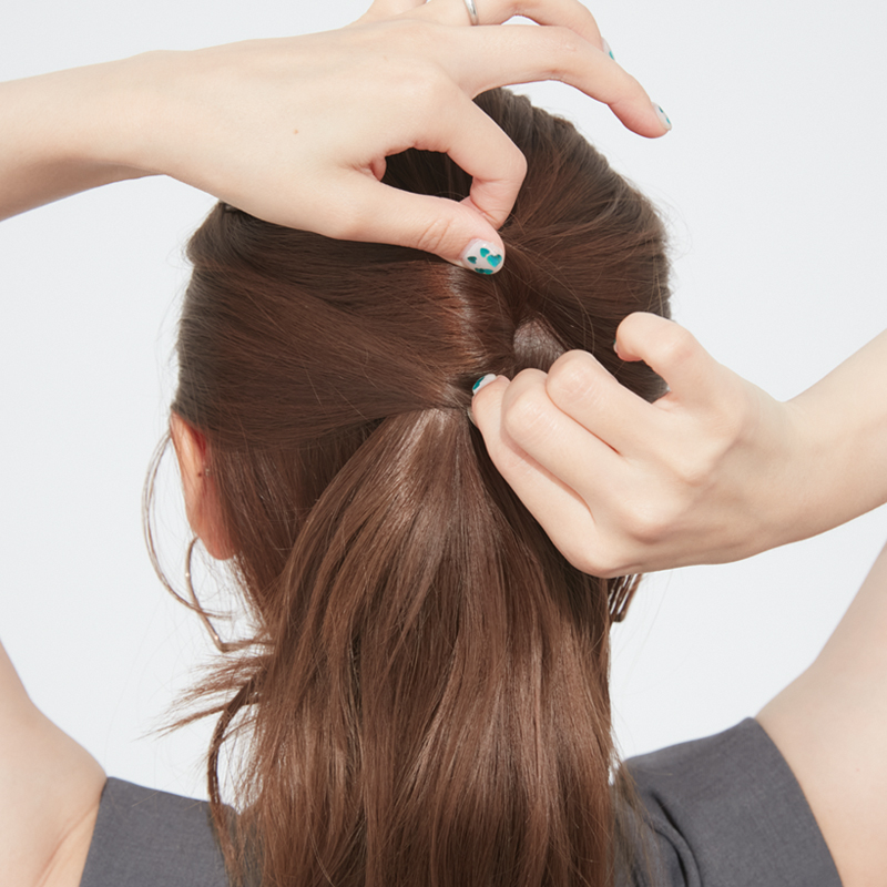 3. 2で結んだゴムの上の部分を1回ねじり、その穴の中に1の毛束を通す。