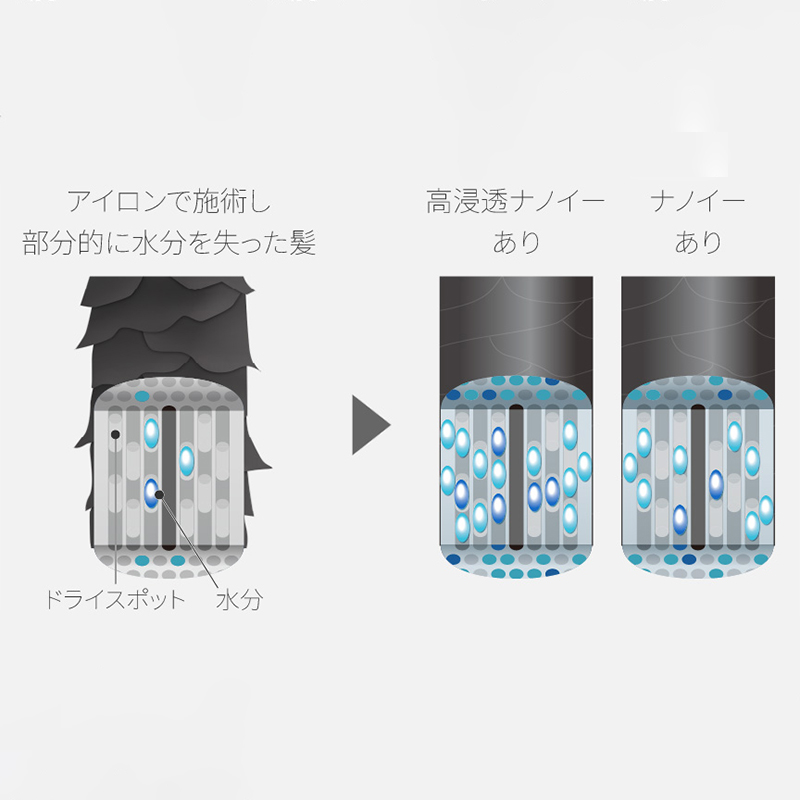 高浸透ナノイー&ミネラル*が髪の内側までうるおいを届ける。さらに傷んだキューティクルを補修・保護