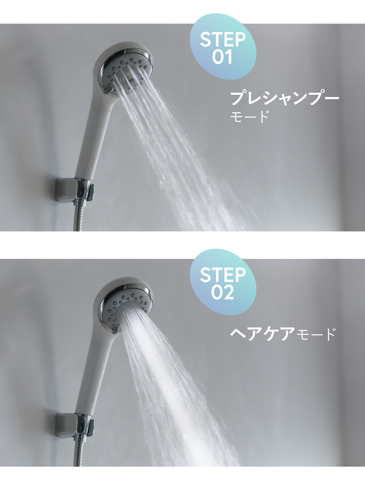 まずは【プレシャンプーモード】のジェット水流で頭皮汚れにアプローチ。さらに【ヘアケアモード】のバブルをたっぷり含んだやわらかい水流で、トリートメントの効果を引き出します。この2つのモードを使った洗髪で、まとまりとツヤ感のある仕上がりに。 ファインバブルシャワーヘッド ファインベール EH-SH50 ※オープン価格