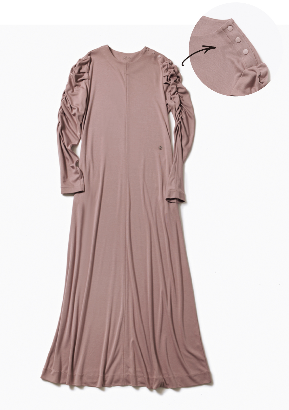 ゆるやかなAラインは気になるお腹周りやお尻周りを隠してくれる賢いデザイン。冷えやすい二の腕にギャザーを施し、布量を多くすることでアプローチ。着脱しやすい左肩のスナップボタンもポイント。