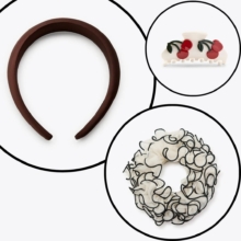 エッジの効いた大きなリボンバレッタは取り外し可能なタイピンチャーム付き。ラフに巻いてサマになるシュシュで後ろ姿を盛り上げて。