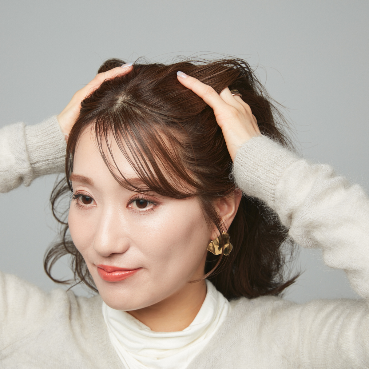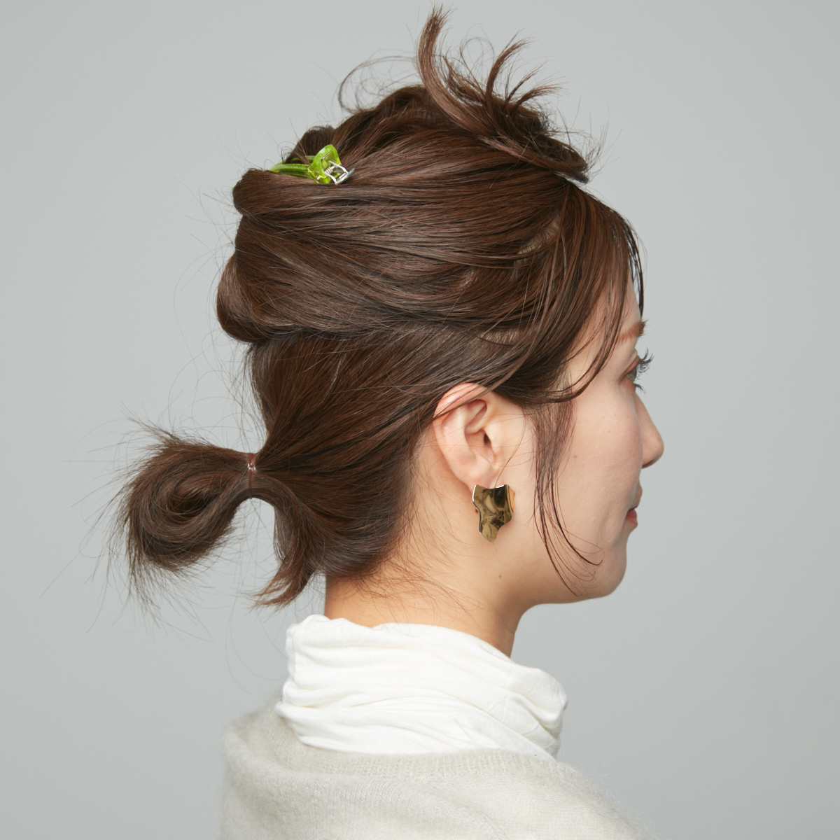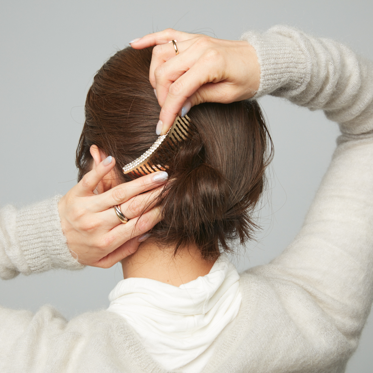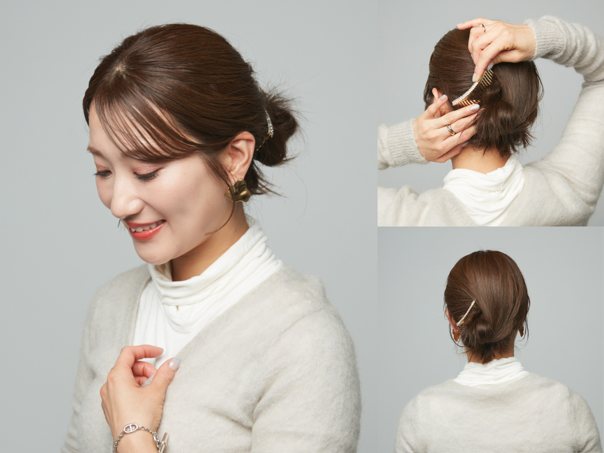 ④上の毛束をシニヨンに巻き付けるようにまとめ、クシ型のヘアアクセで固定する。