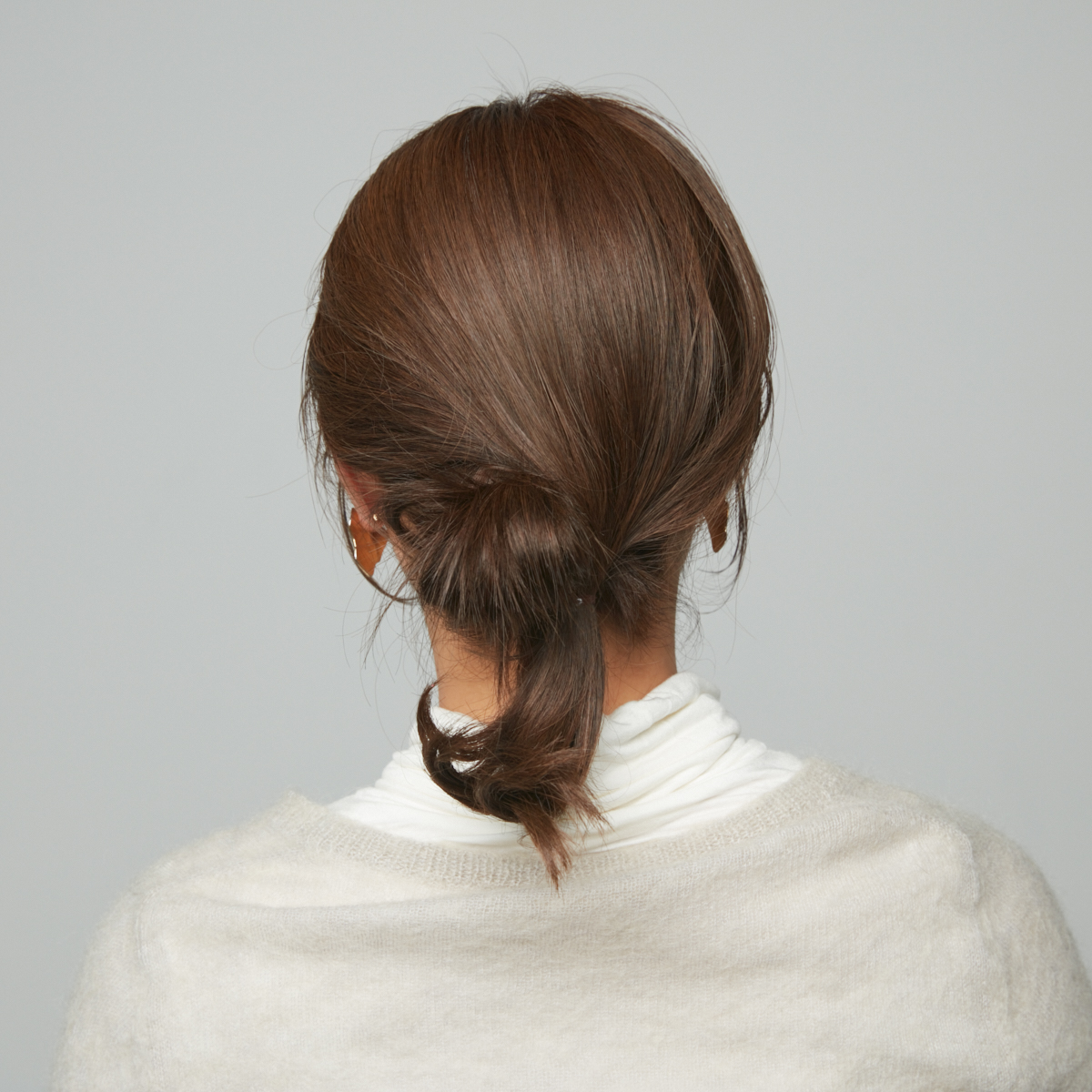 ②耳上の位置で真っ直ぐ上下に髪を分け、上は仮留めしておく。下をひとつにまとめ、シニヨンを作る。ここが土台になるので、耳下の低めの位置に作っておく。