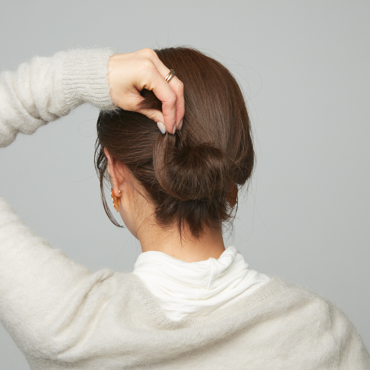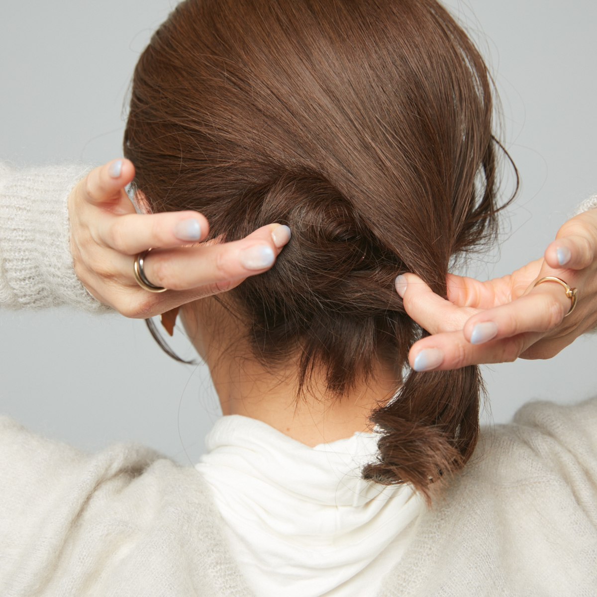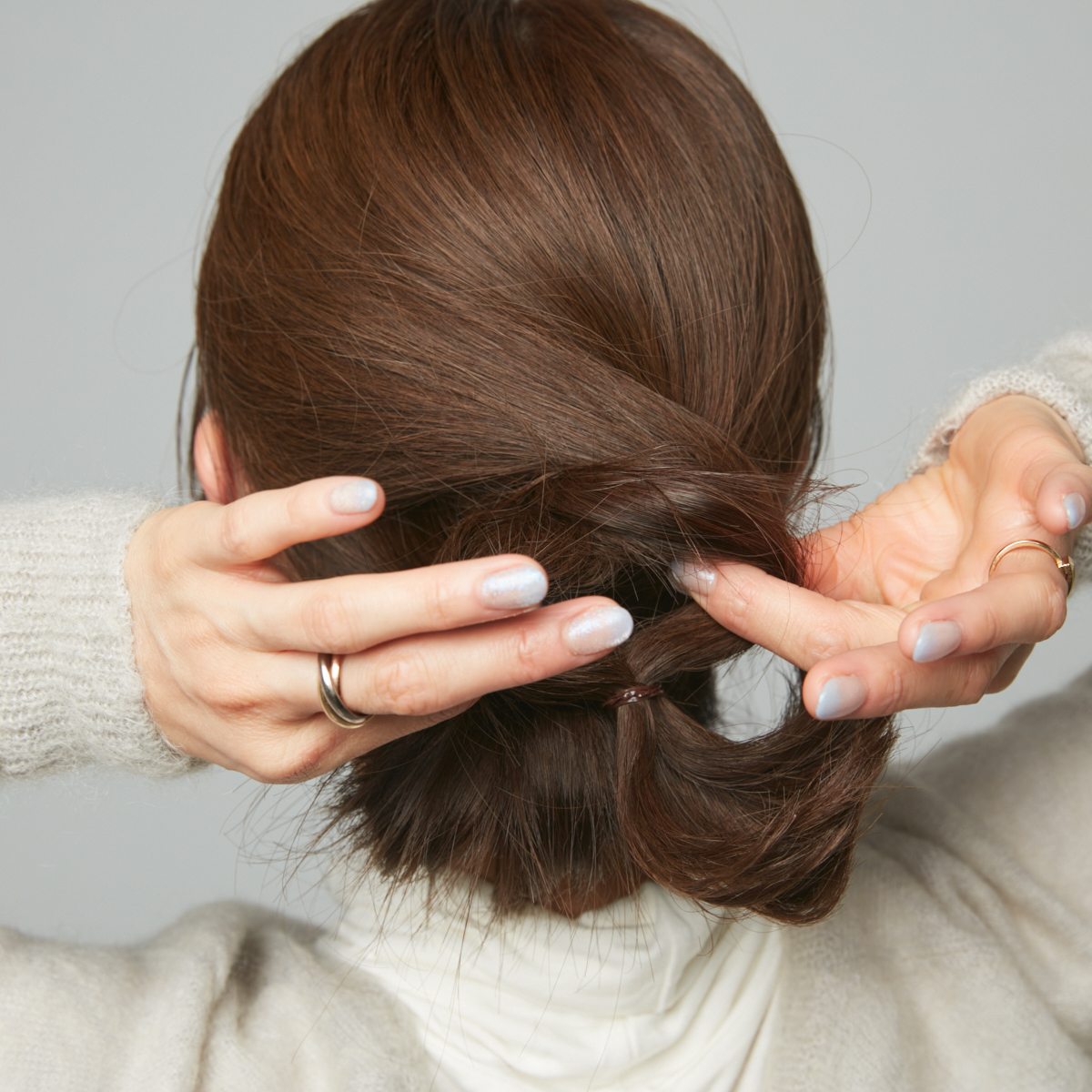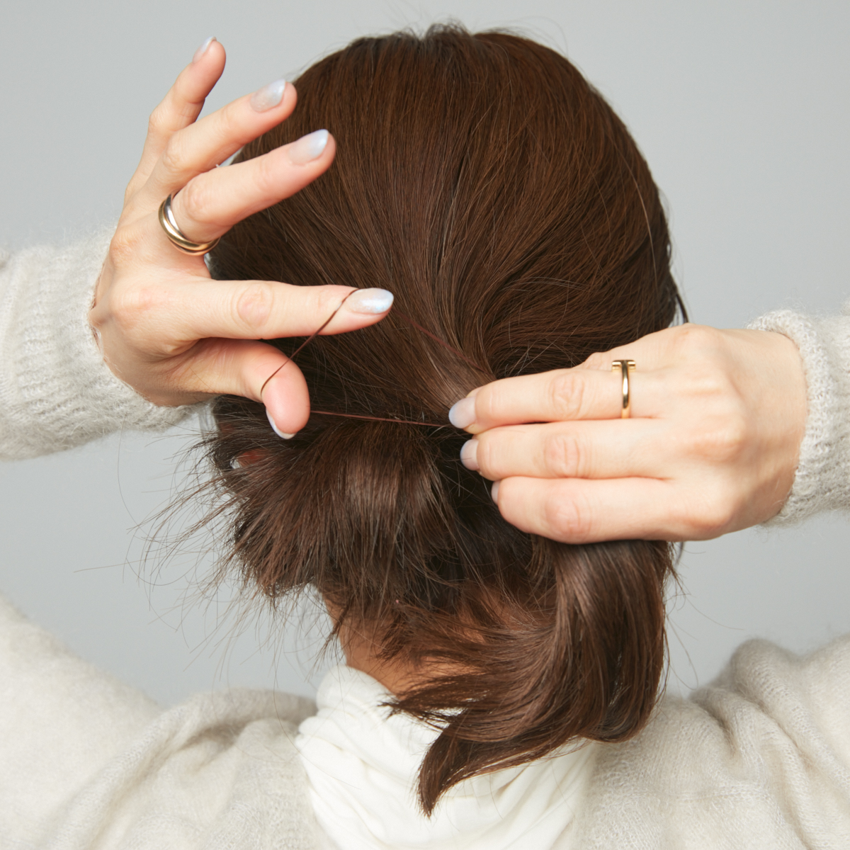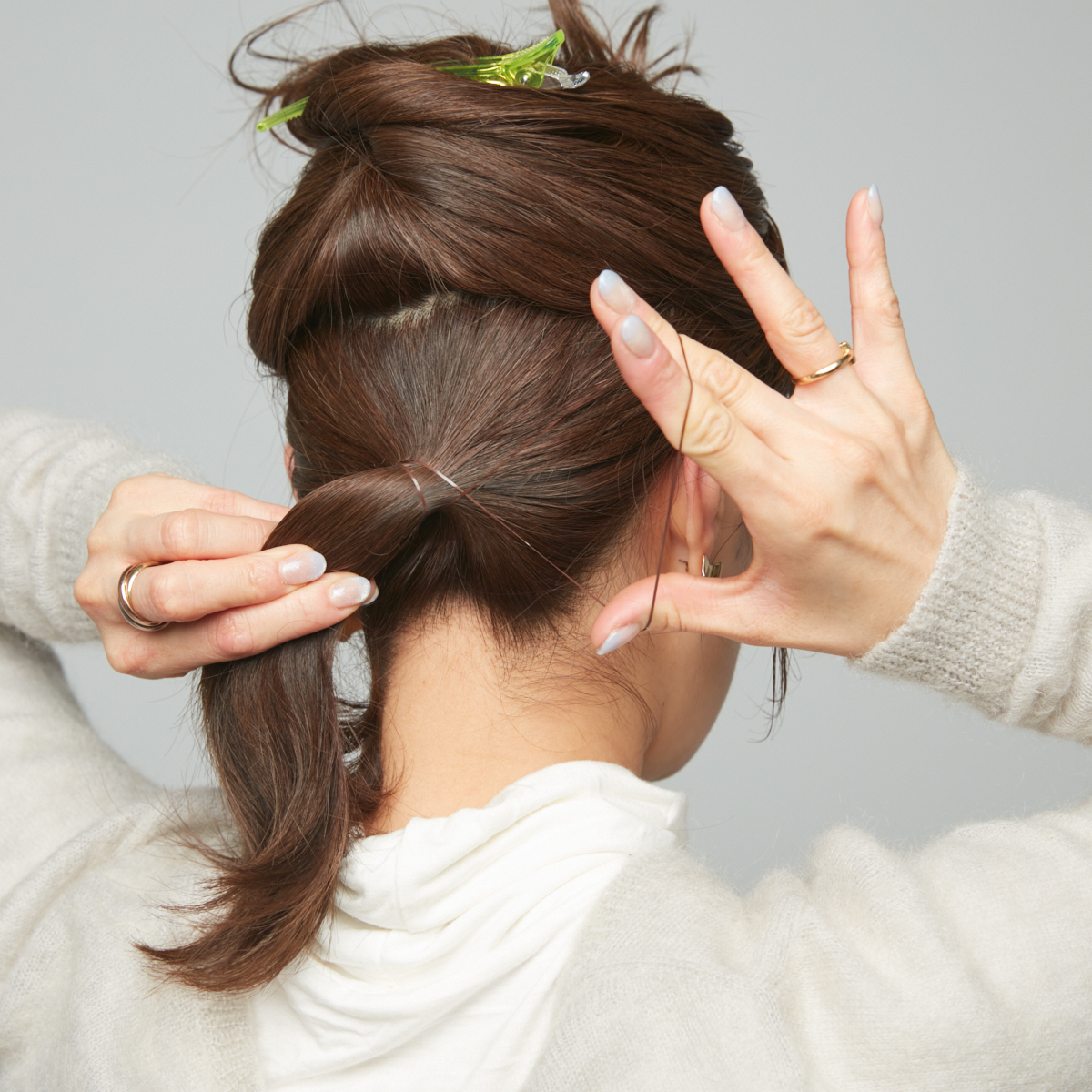 ③仮留めをはずし、上の毛束をゆるめに結ぶ。ゴムの上をねじり、ねじった毛束の間にシニヨンを通す。