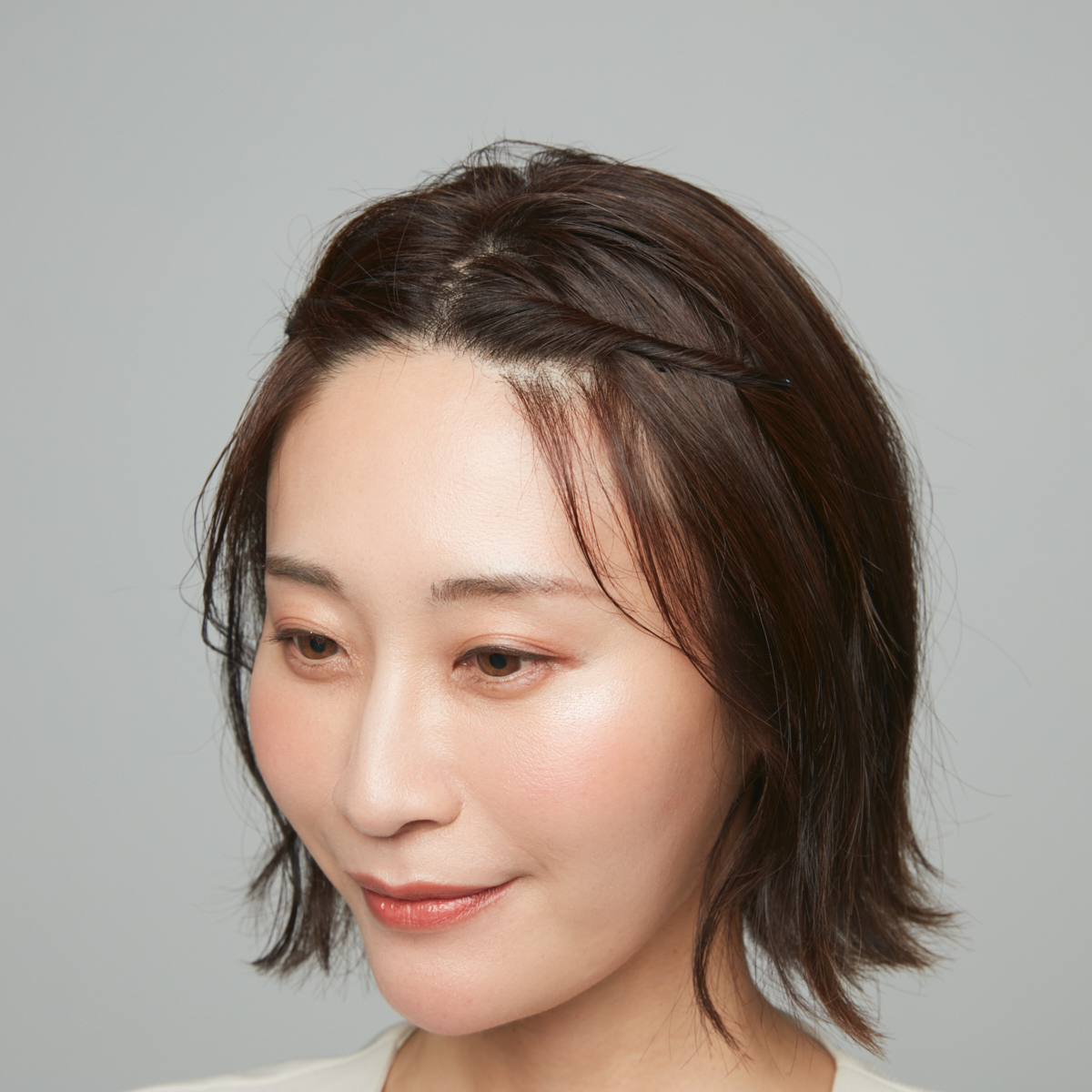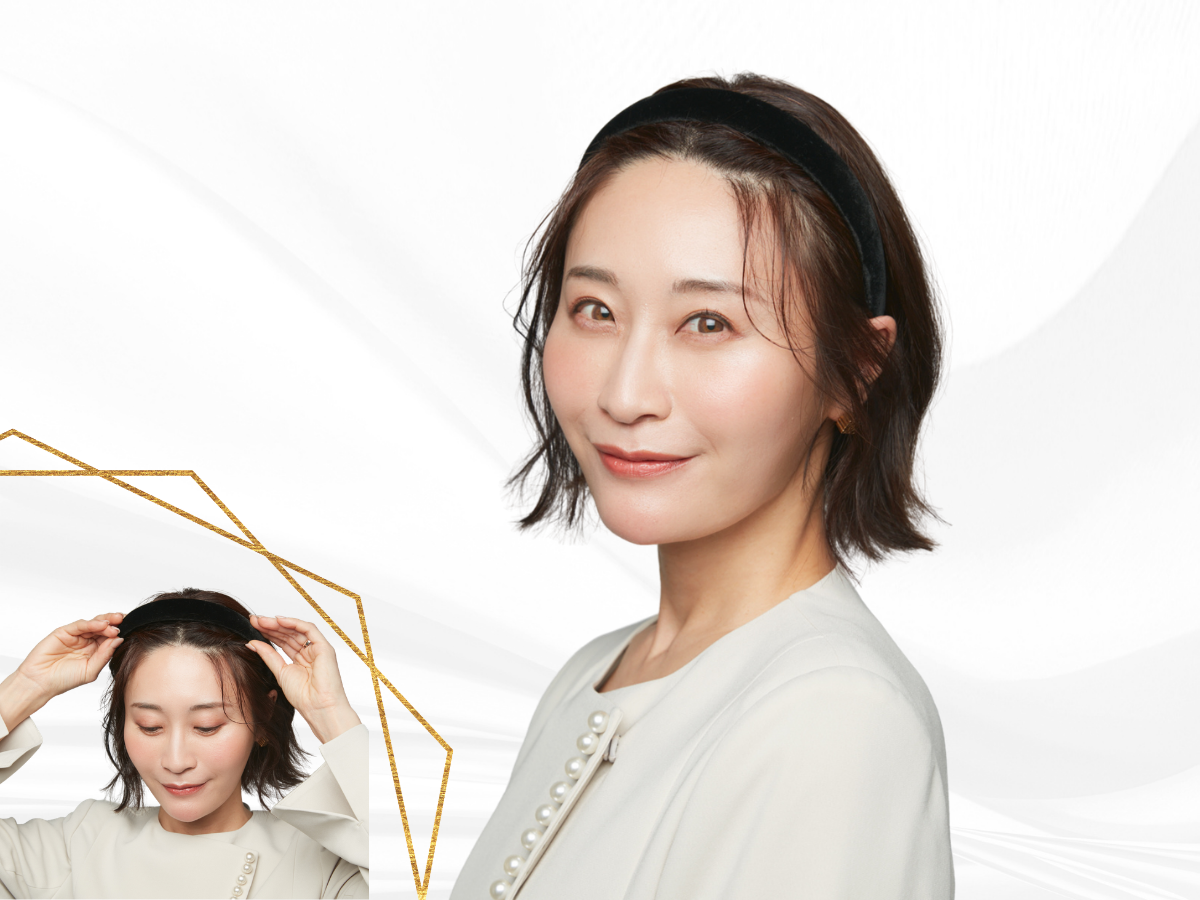 前髪は印象を大きく左右するパーツ。セレモニーなど、特別な日は前髪を上げるだけでも雰囲気が変わります。今回は前髪をねじってまとめ、その上からカチューシャを付けるアレンジ。いつも使っているカチューシャもこれだけで新鮮な印象になります。「おでこを見せるのは抵抗がある」という人は、額の角を隠すことを意識するのがコツ。より小顔に見せることができます。