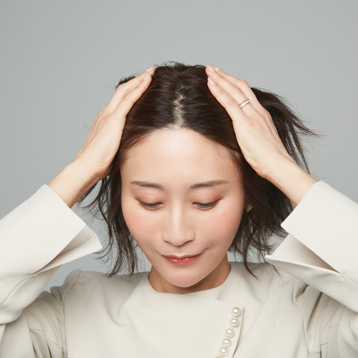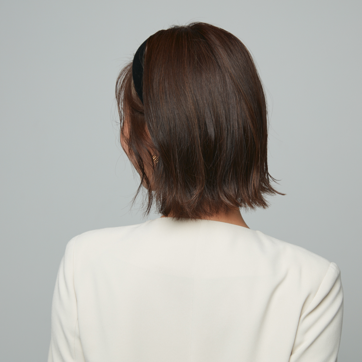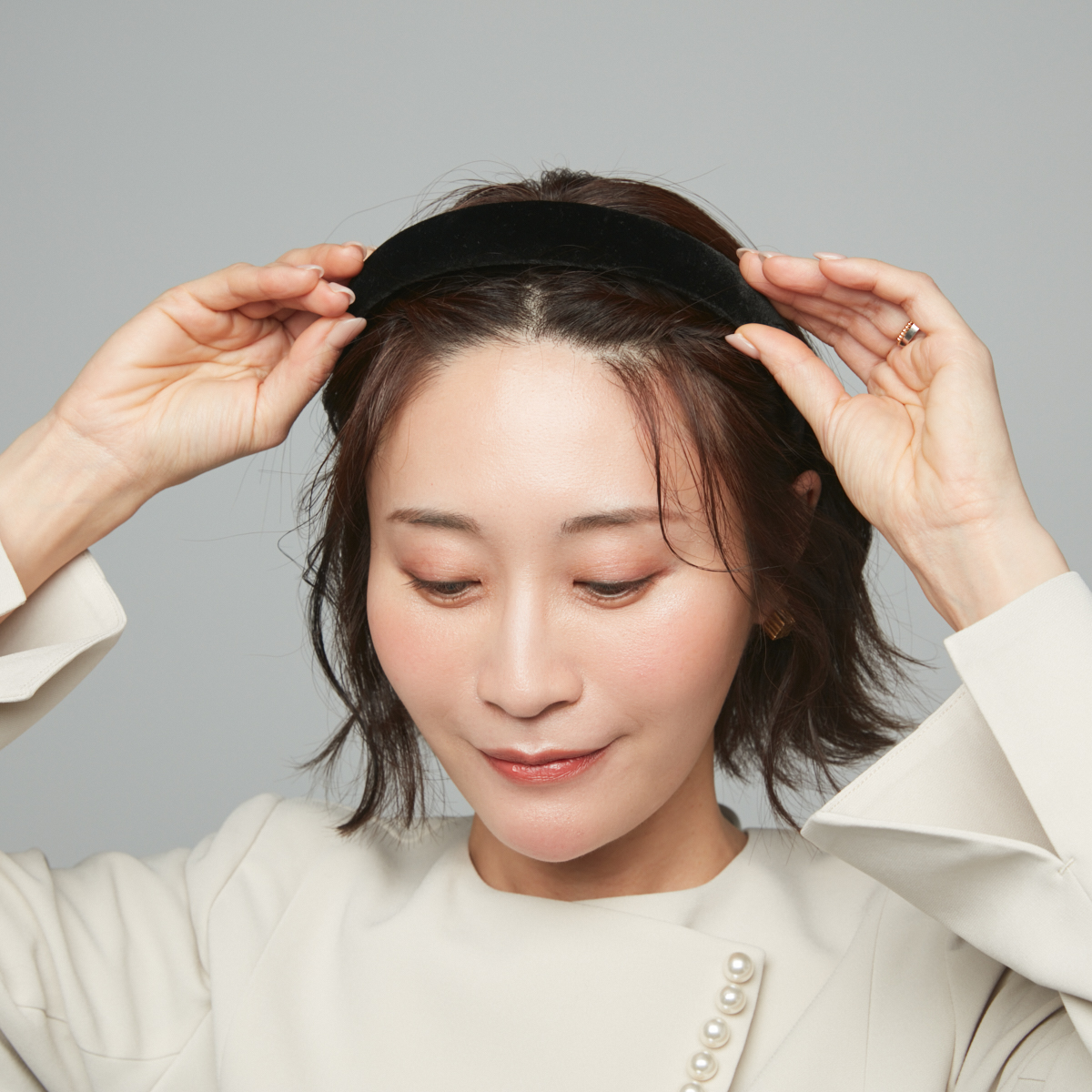④カチューシャをトップより前めの位置に付けたら、仕上げにバームで毛先の質感を整える。カチューシャをやや前寄りにすると頭頂部までの距離が短く見え、さらに小顔効果が期待できる。セレモニーの日は、ベロアやレザーなど上質感のある素材のカチューシャがおすすめ。