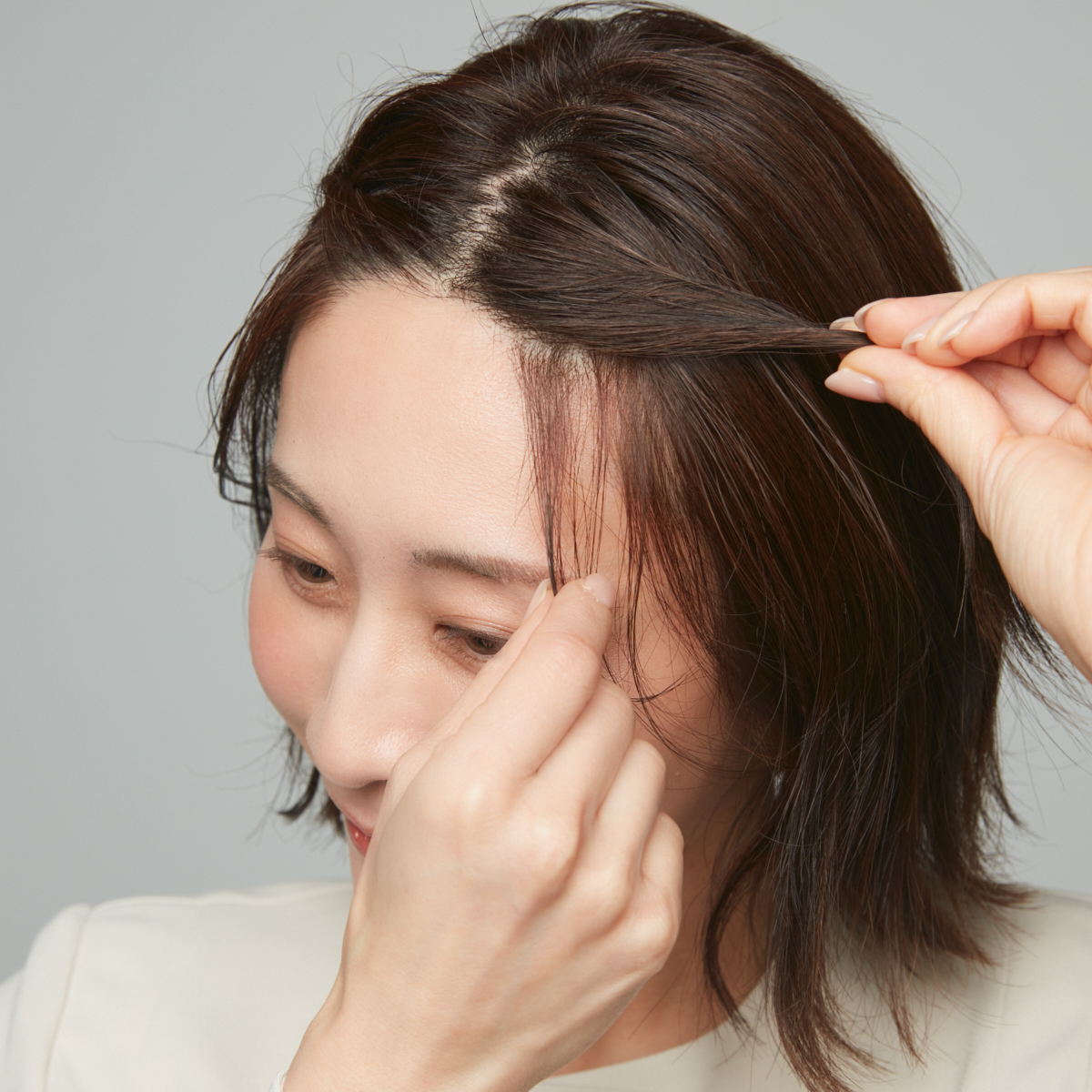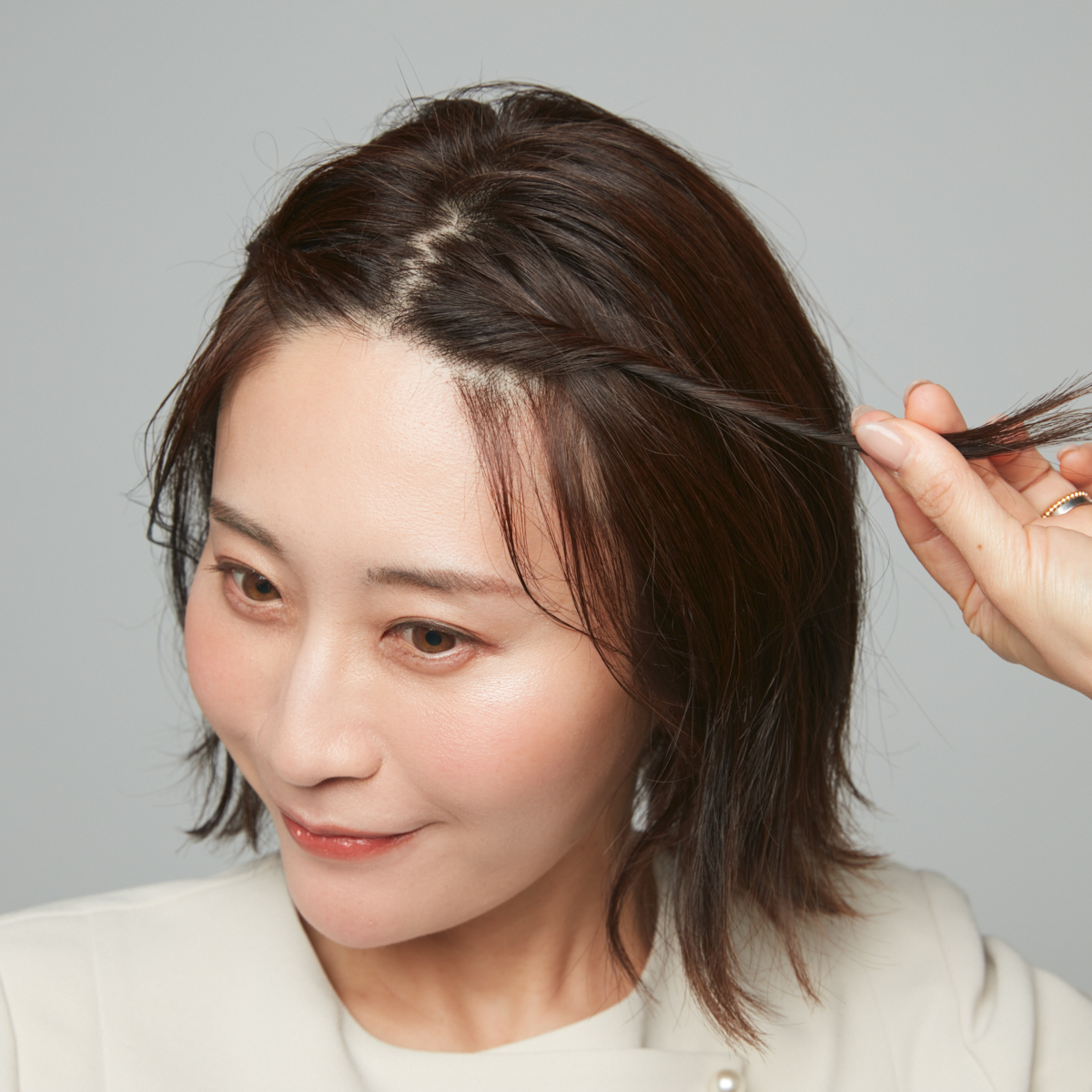 ②前髪を分け取る。真ん中でジグザグに分けたら、額の角を隠すように前髪を少し残しておく。このひと手間で顔の余白がカバーされ、小顔に見せることができる。