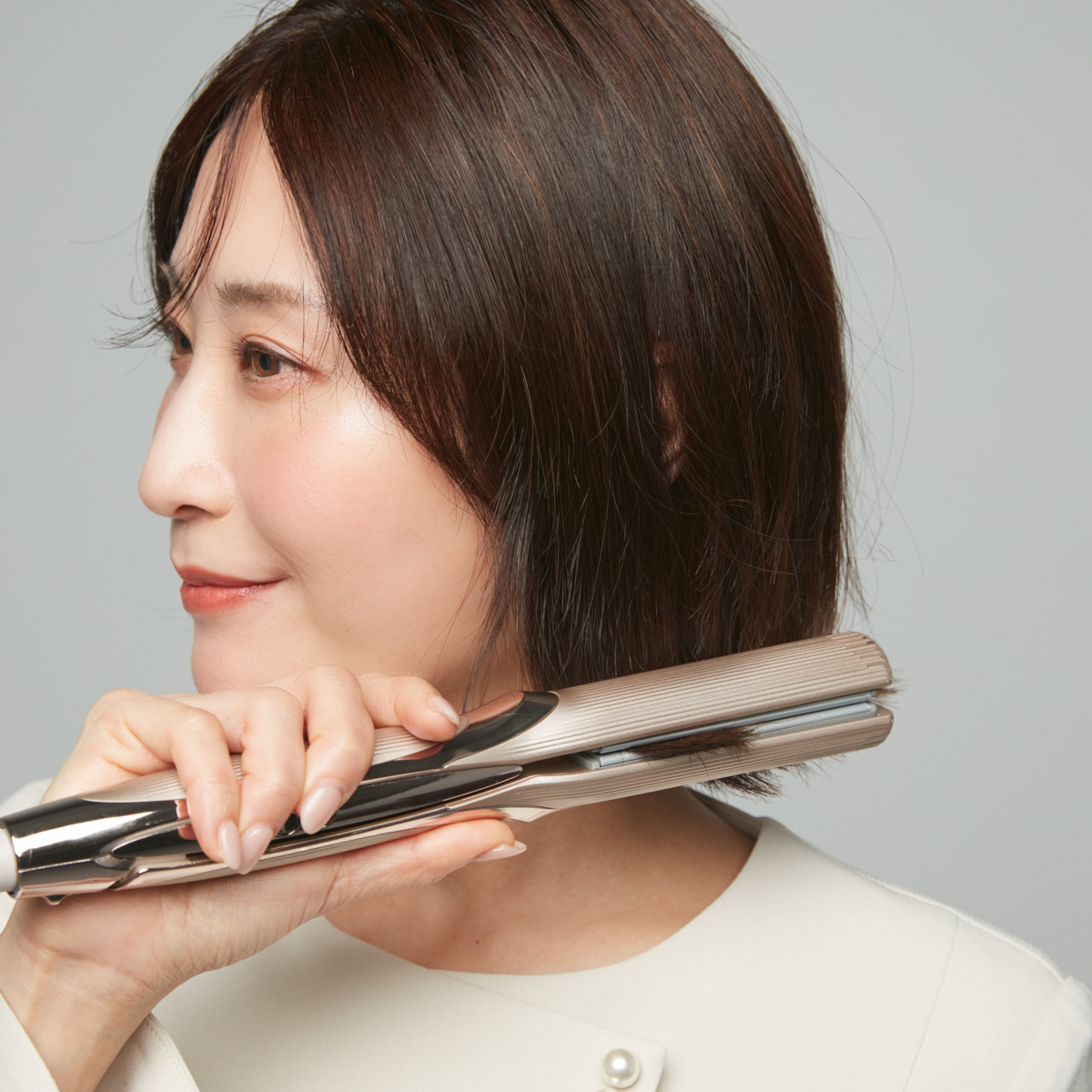①ストレートアイロンで毛先を外ハネにする。今回は前髪をねじるアレンジなので、前髪部分を中心にバームをなじませておくとより扱いやすく。爪先くらいの量を目安に、毛量が多い場合は重ね付けする。