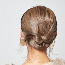 ④バレッタをつける。ゴムの上につけると浮いてしまうので、地肌に沿わせつつゴムで結んだ毛束を挟んで留めると頭にフィットさせることができる。右サイドも同様にバレッタをつけて完成。
