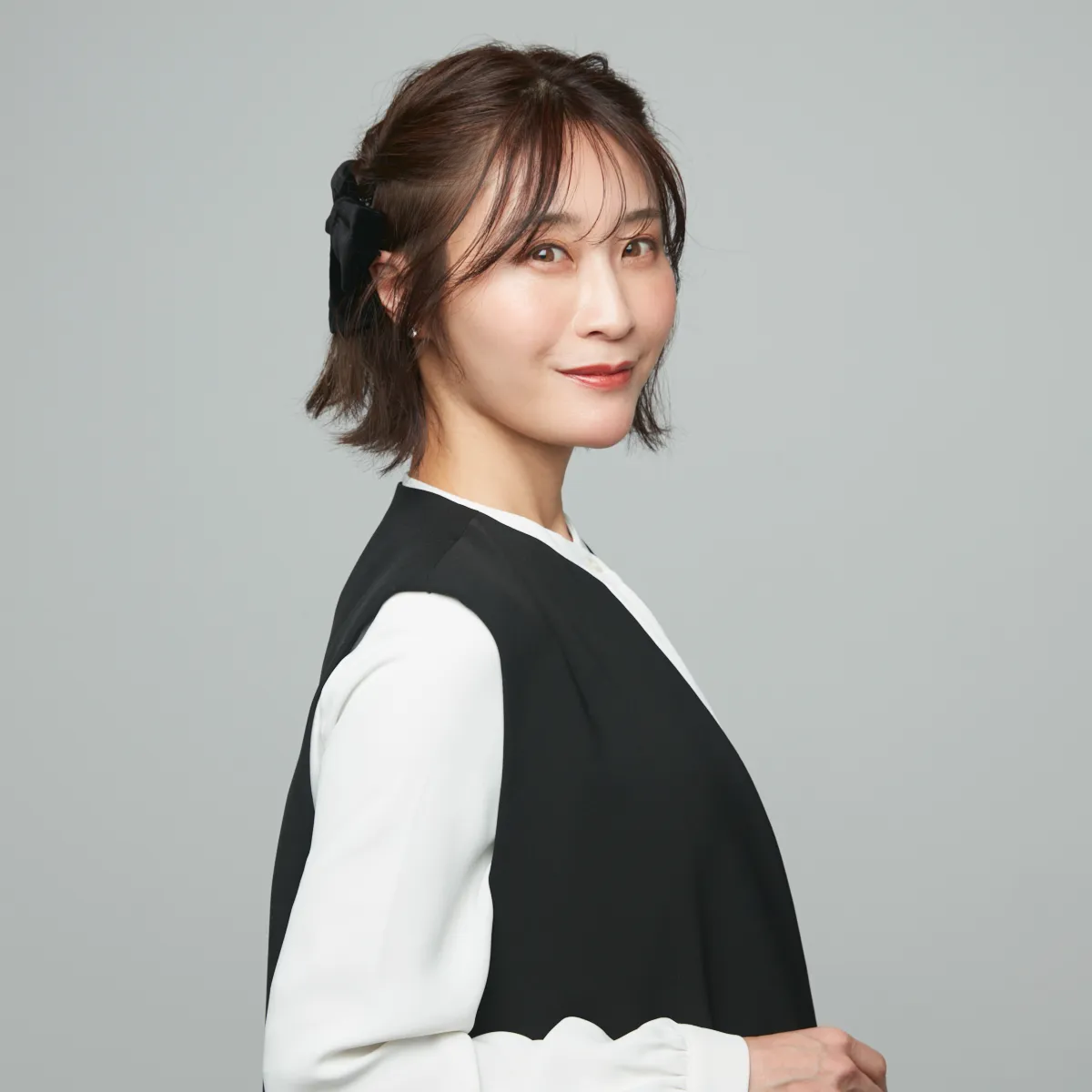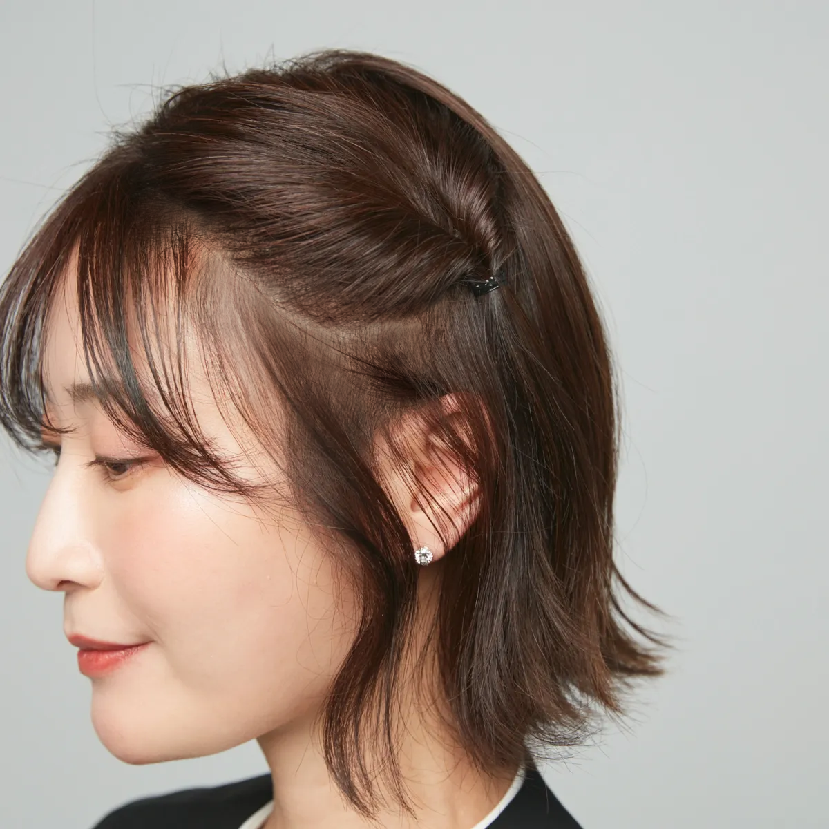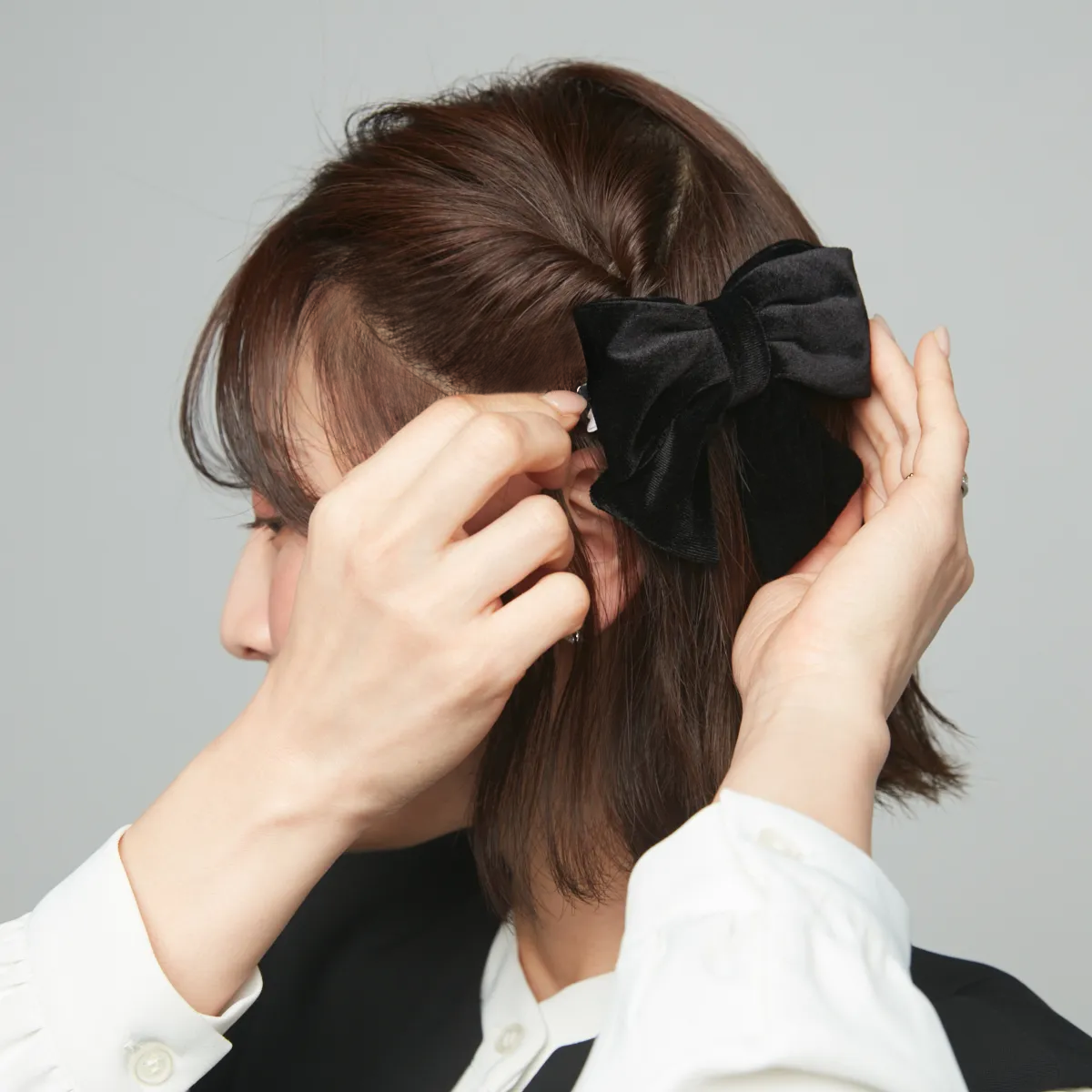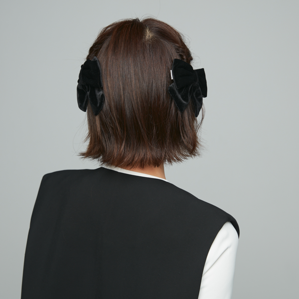 セレモニー用にヘアアクセを選ぶなら、デイリーにも使えるバレッタがおすすめ。甘くなりがちなリボンモチーフも、ベロアの黒を選べば大人っぽく。紹介するのは、両サイドをバレッタで留めるだけでできるアレンジなので、伸ばしかけやボブの長さでもトライしやすいです。