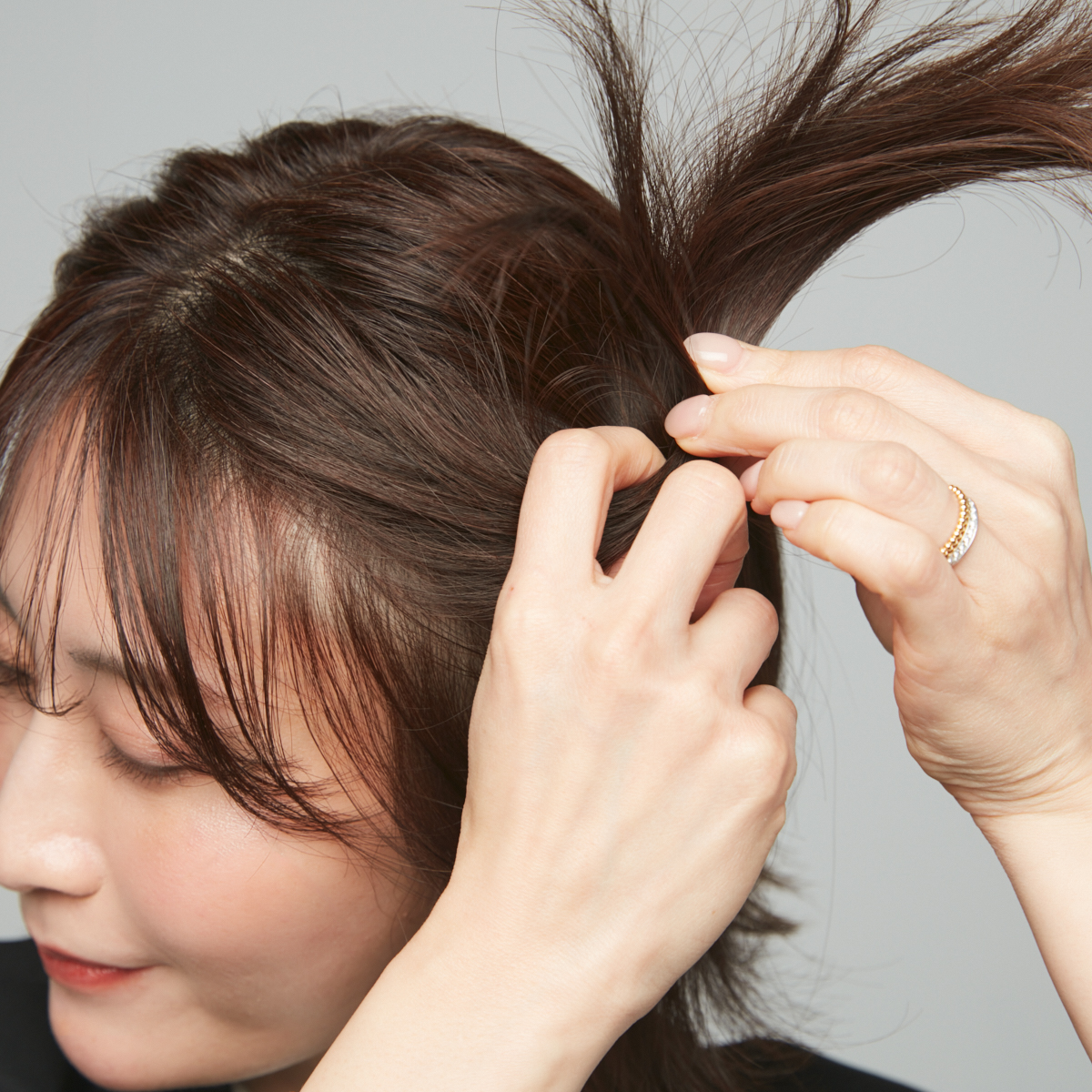 ③ゴムの上のあたりに穴をあけ、上から毛束を通してくるりんぱにする。くるりんぱしたら、ゴム部分を持ちながら毛束を上につまむようにしてほぐす。
