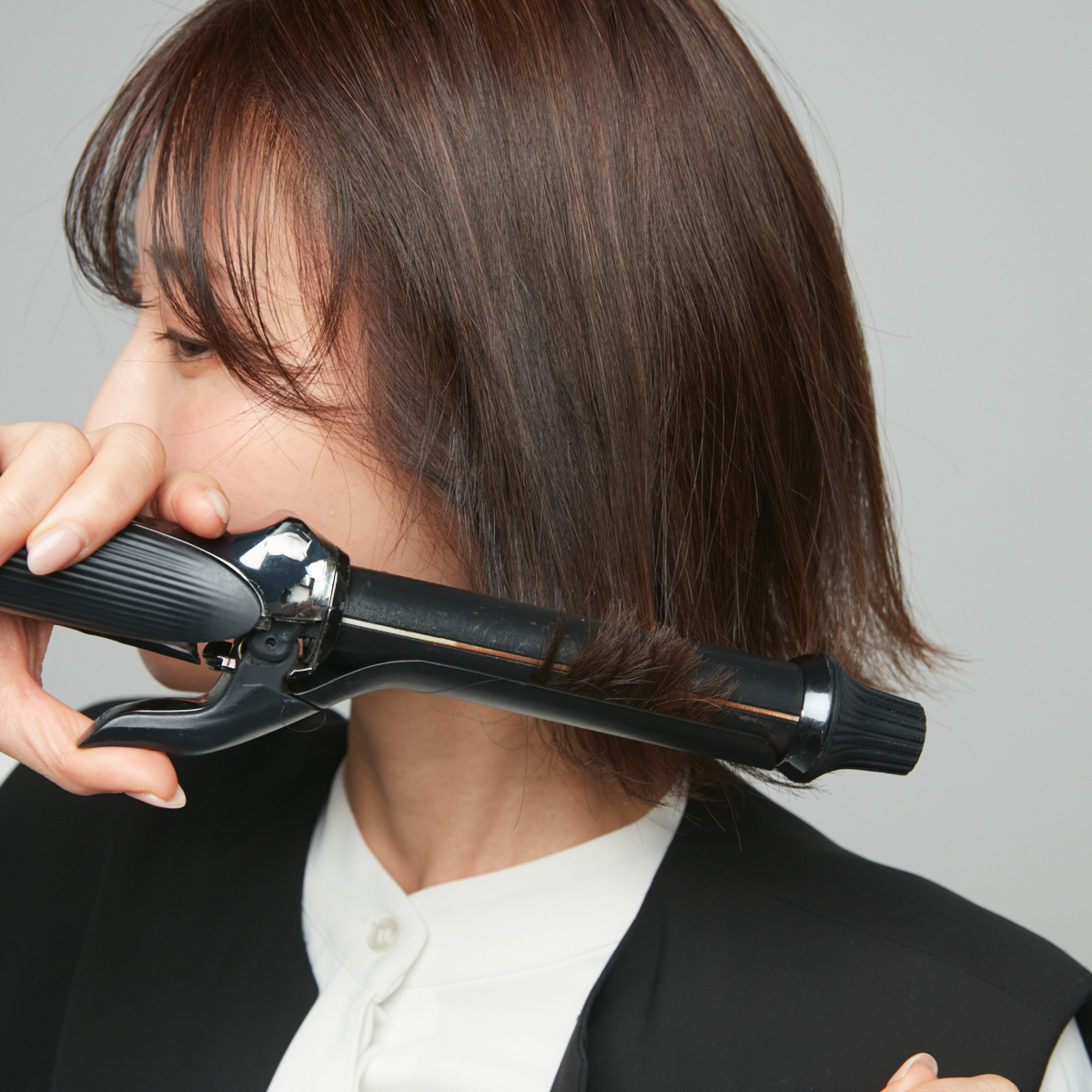 ①26㎜のアイロンを使い、全体の毛先を外ハネにする。ストレートアイロンでもOKだが、カールアイロンのほうがよりしっかりとしたカールを作ることができる。