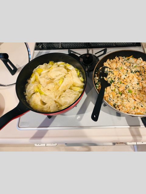 我が家にレミパンが!(左) 早速、水餃子たっぷりすぎのスープを作りました。活用するのが楽しみ。