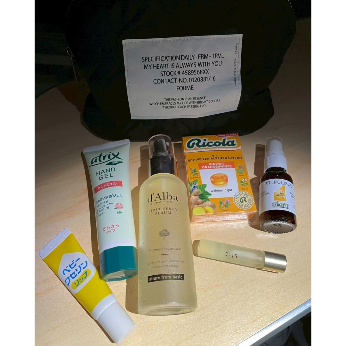まず、何はなくとも乾燥対策。特に日本行きの機内では、着いたらすぐにお仕事が控えているので、絶対にコンディションを崩せない! 家のあちこちに置いているベビーワセリンリップや、学生時代から一途に愛用しているアトリックスのハンドクリームは、ポーチにもマスト。肌の乾燥対策には、スプレータイプが便利。ダルバのFIRST SPRAY SERUMを持ち込みます。撮影では意外と手元がよく写るので、ukaのネイルオイルでしっかりケアを。機内でも気にならない自然な香りも癒やしです。