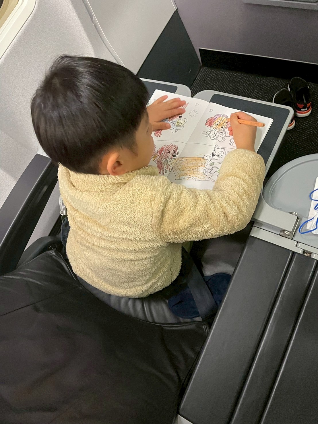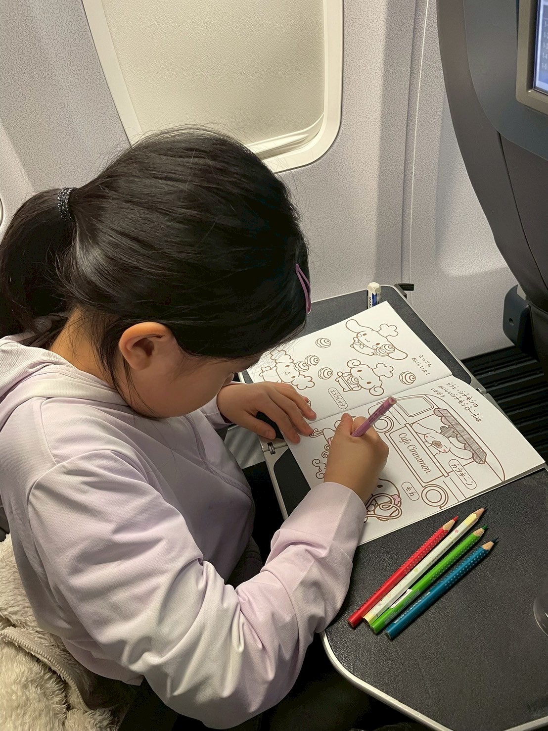 少し前までは、2人分の大量のお菓子に、おもちゃやお絵かきアイテムやシール(なるべく間を持たせるために、事前にこっそり買っておいた目新しいもの!)、最終手段のYouTubeをオフラインで観られるように設定したタブレット、着替え、離乳食、オムツ…。大きなトートバッグ2つがパンパンになるくらい子どもたちのグッズを持ち込んで、大変だったなぁ。長いフライトですが、私自身は寝られない覚悟で乗っていました。
