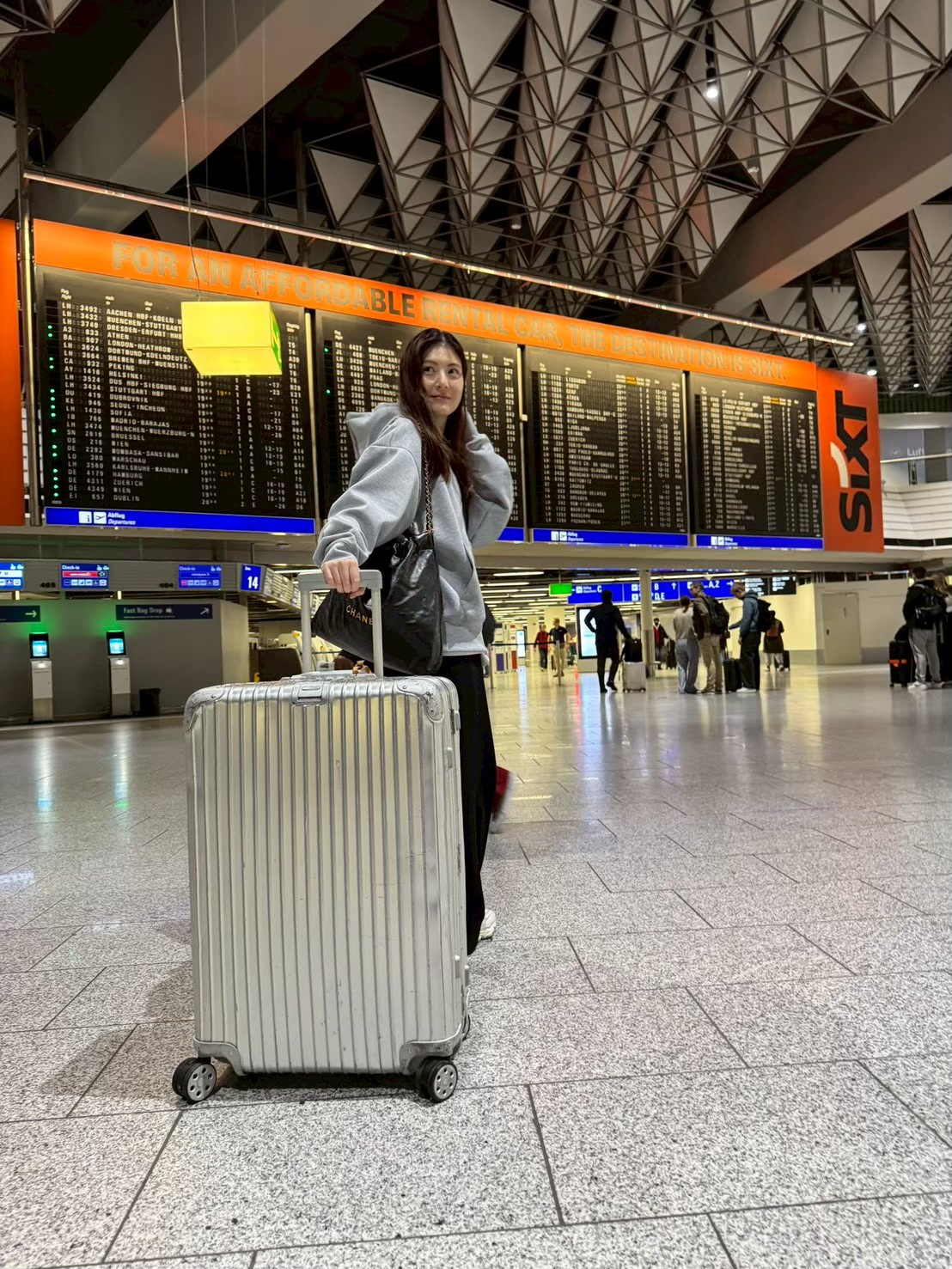 機内ファッションはスウェットが定番。ジップタイプなら脱ぎ着も楽なので、いつも可愛いのを探しています。今回着ていたのはSEAのもの。スーツケースはRIMOWAを長く使っています。実際は1つでは足りず、家族分もあるとかなりの数に! 今では3つくらいなら余裕で運べるようになりました(笑)。
