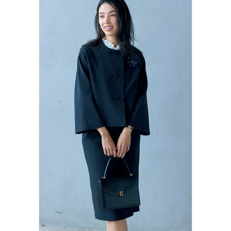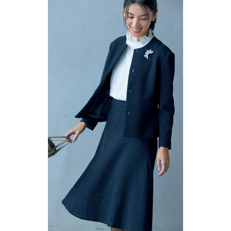 オールマイティに着回せるのはやっぱりネイビースーツ。優しげに見えるノーカラー&華やかに見えるデザインで通勤スーツとの違いを。