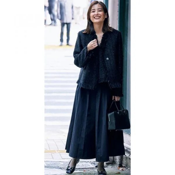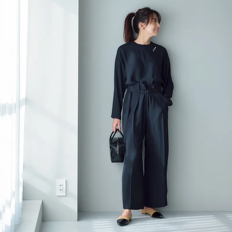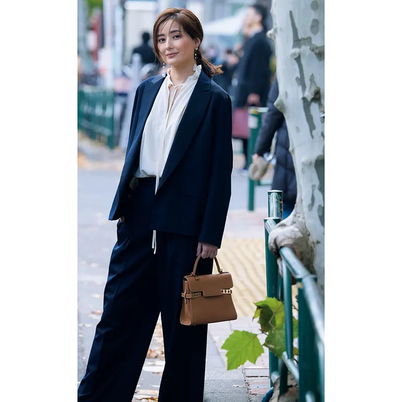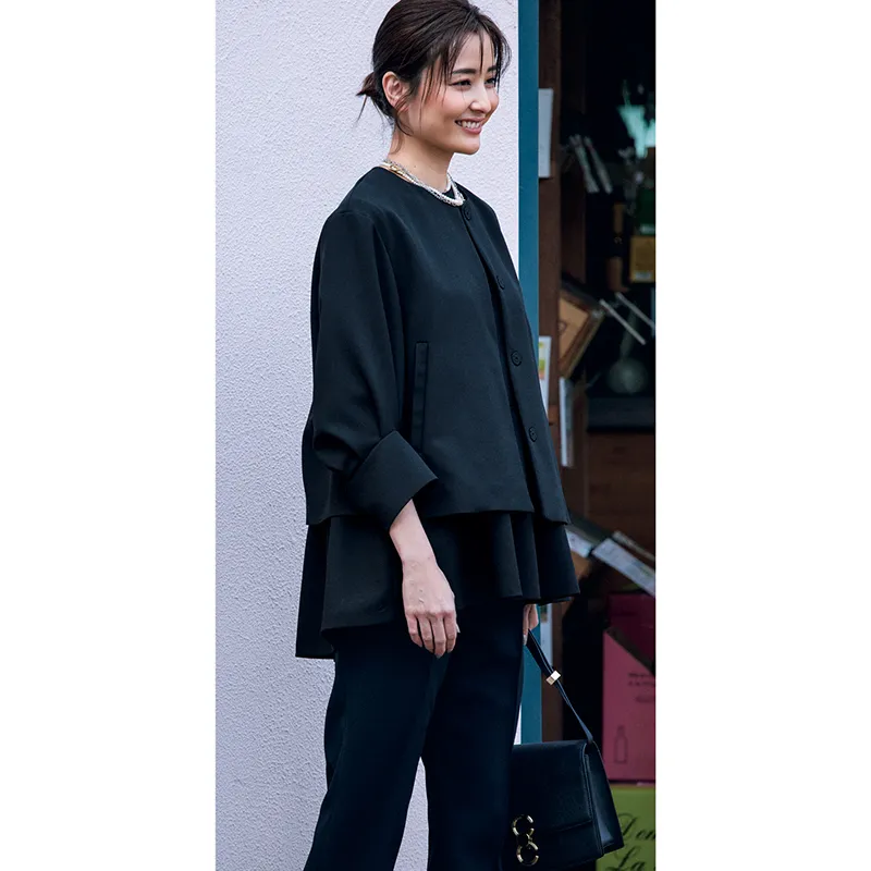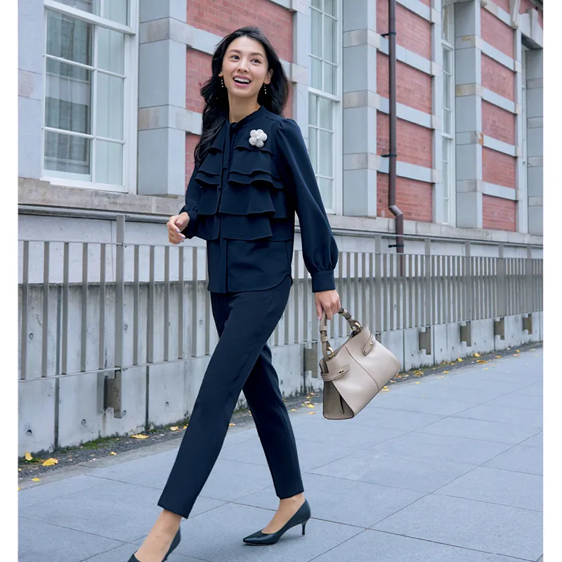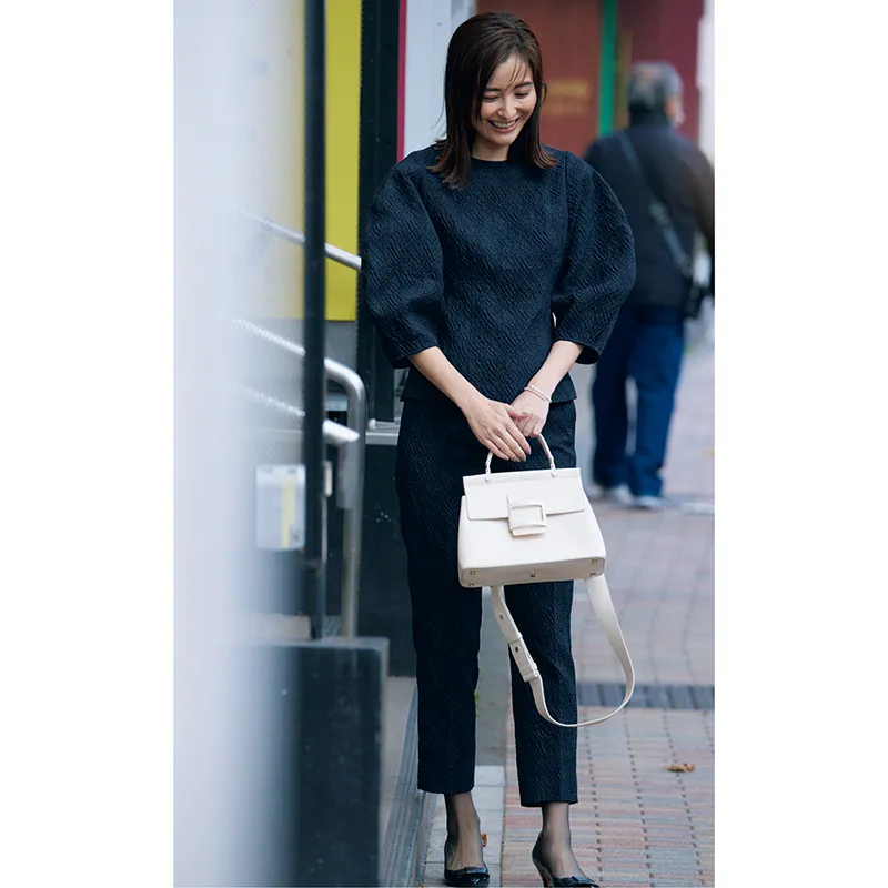 ジャケットなしでも着られる肉厚で適度なハリとツヤのあるブラウスは、ランダムフリルが華やか。全身ダークカラーの時は、バッグを明るい色にするとバランスが良くなります。