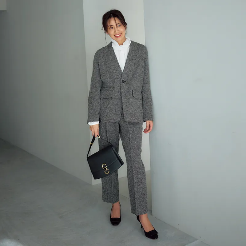 シンプルなスーツを選んでおけば、ブラウス、ニット、Tシャツなど、インナーで印象が変化。また、ネックレス、スカーフ、コサージュやブローチで華やかにアレンジすることも。ベースのスーツがシンプルであるほど、さまざまな雰囲気をスタイリングで楽しめます。