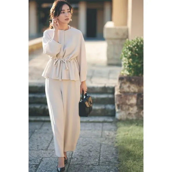 自由な雰囲気の園や学校なら、ワンピースやパンツのセットアップ、ここ数年人気のジレセットアップでも十分。明るい色にこだわらず、ネイビーやブラックのママも多いようです。ただ、お祝いの行事なので、ピアスやネックレス、トップスのデザインなどで華やかさを足すことは忘れずに。