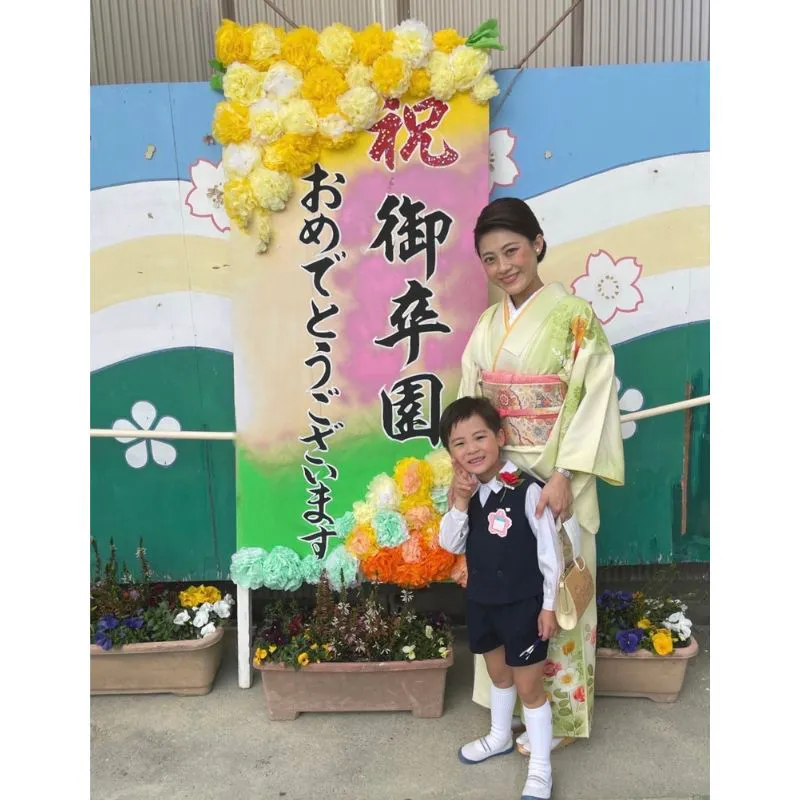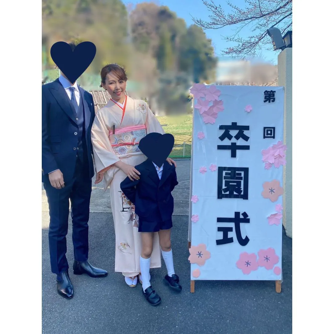 「卒園式は外部のホールで行われるので、例年厳かな雰囲気で着物での出席率も高め。仲のいいママ友たちと一緒に着物を着ることにしました。苦楽園のトータルビューティーサロンNymphaea(ニンフェア)で着物のレンタルと自宅で出張着付けを、へアは美容師である夫に頼みました。着物は事前にラインで候補の写真が送られてきたなかから選ぶスタイルで、落ち着いた色に古典的な柄と色合いが素敵で選びました。また記念写真をたくさん撮ることを考えて、眉とリップは普段より少し濃いめにしたのですが、それが正解でした!