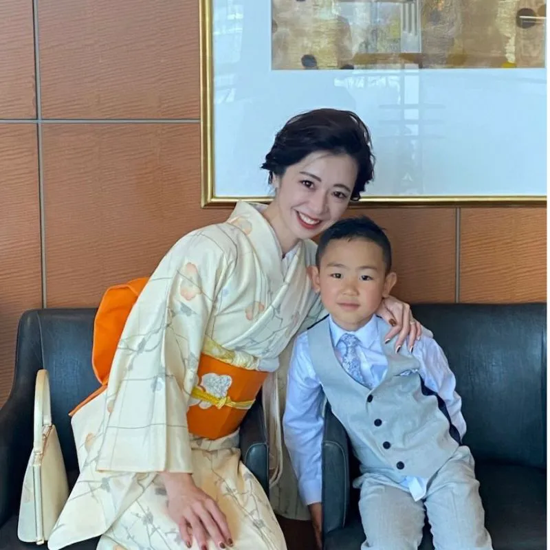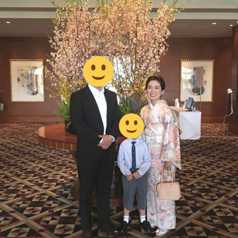 長男が通っていたインターナショナルスクールは毎年合同卒園式で会場は決まってホテル。入園式も卒園式も多くの方が和装で参加しているため、私も華やかな着物を選びました。子どもの行事があるごとに義母のものを借りているのですが、今回は春らしい柔らかな色の着物にオレンジの帯で全体を引き締めました。ヘアセットはnot nowのmiyukiさんにオーダーし、オールバックで落ち着いた印象に。着付けは私がオーナーをしているネイルサロンのお客様で着付けができる仲のいい方がいて、自宅に来ていただき着付けてもらいました。