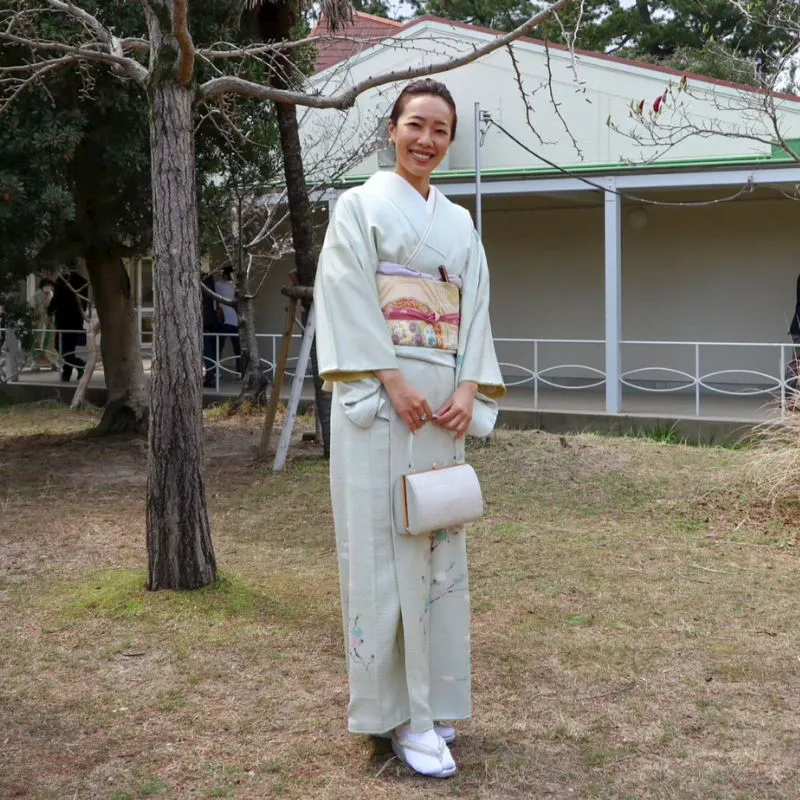 卒園式に合うように、寒色で柄の少ない加賀友禅の訪問着を選びました。子どもが主役なので控えめにしましたが、帯は上品ながら華やかなものにしたのでバランスが取れて場に華を添えられたかなと思います。着物の時はアクセサリーも派手な物ではなく小ぶりのデザインで最小限にして、ブランドバッグではなく、和装バッグを合わせるのがこだわりです。