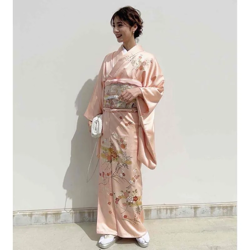 ホテルの雰囲気に合わせたおめでたいお花の手書きの染めが美しい着物に