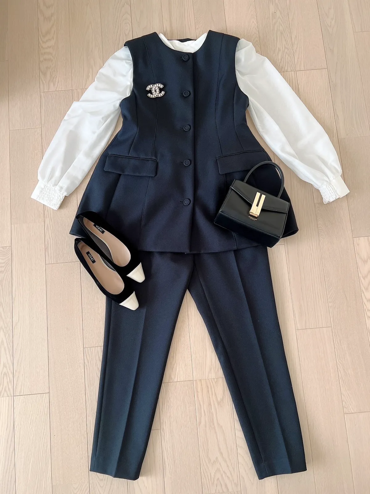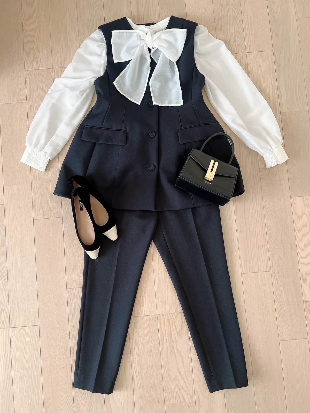 「2年前の長男の入園式は春先でも体育館は寒かったので、今回は防寒のためパンツスタイルに。そこまでかしこまった雰囲気の園ではないので、ジレのセットアップを選びました。ブラウスは2WAYタイプなので、華やかにリボン結びでいくか、シンプルにしてブローチをつけるか悩み中です。今回は入園式だけなのでどちらかを選びますが、2式参加予定があるなら着方で雰囲気を変えるのもありだなと思います」奥平可彩根さん/39歳・主婦(5歳と3歳の男の子ママ)