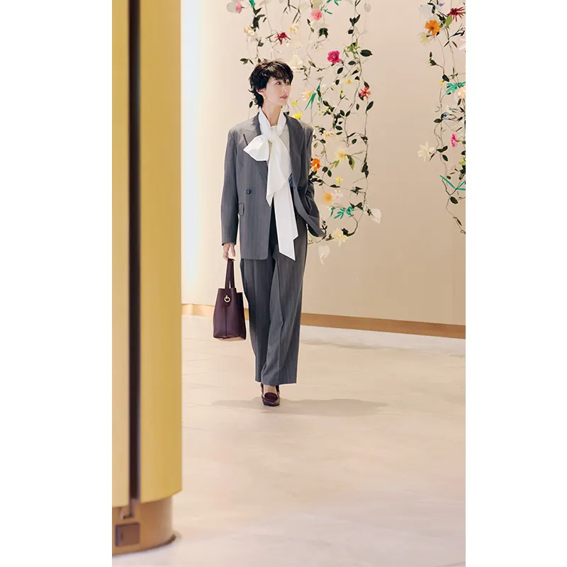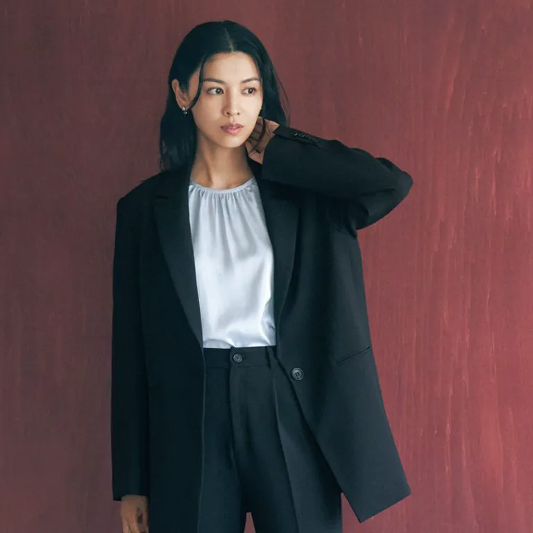 甘すぎるディテールや子どもっぽいアイテムには手が伸びづらくなってくる40代。卒園式・卒業式には上質素材のミニマルスーツが使えます。凛とした印象が際立つシンプルデザインは、式後も長く着られるので1着持っておくと便利。手持のアイテムとも合わせやすく、オフィススタイルにもハマります。ジャケットの丈が少し長めのものを選ぶとトレンド感を出せるうえ、腰回りもさりげなくカバー。体のシルエットを拾いにくく、パンツスタイルに苦手意識のある方でも挑戦しやすいコーデです。
