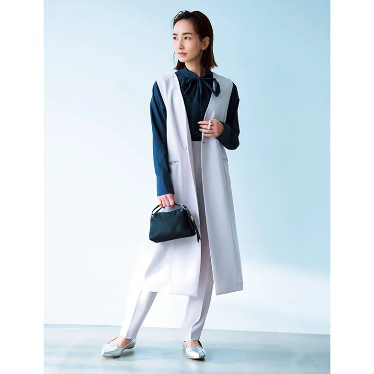 縦長効果でスタイルアップを叶えるロングジレ&パンツコーデ。40代が選ぶなら明るめカラーがおすすめです。グレーやピンク、パープルにも見えるニュアンスカラーが地味に見えがちなセレモニースタイルのイメージを払拭。クールでありながら女性らしい柔らかさも感じさせるコーデに。