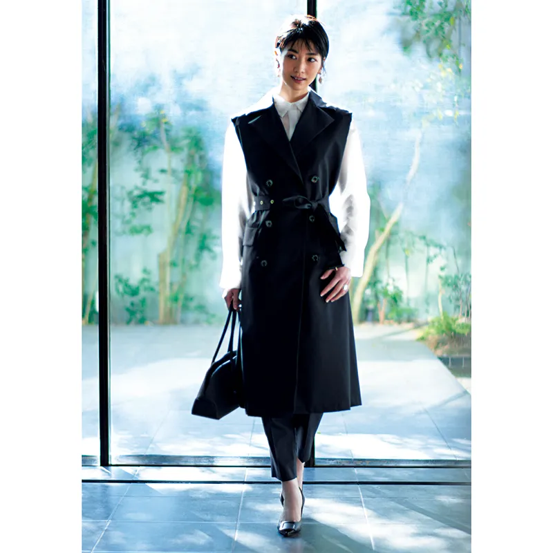 ぴったりとしたシルエットのスーツに抵抗がある場合は、気になるところを上手に隠してくれるアイテム選びが賢い選択。普段の着こなしの延長で、着やせ効果やスタイルアップを意識してみて。