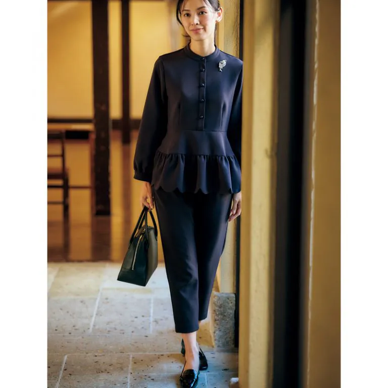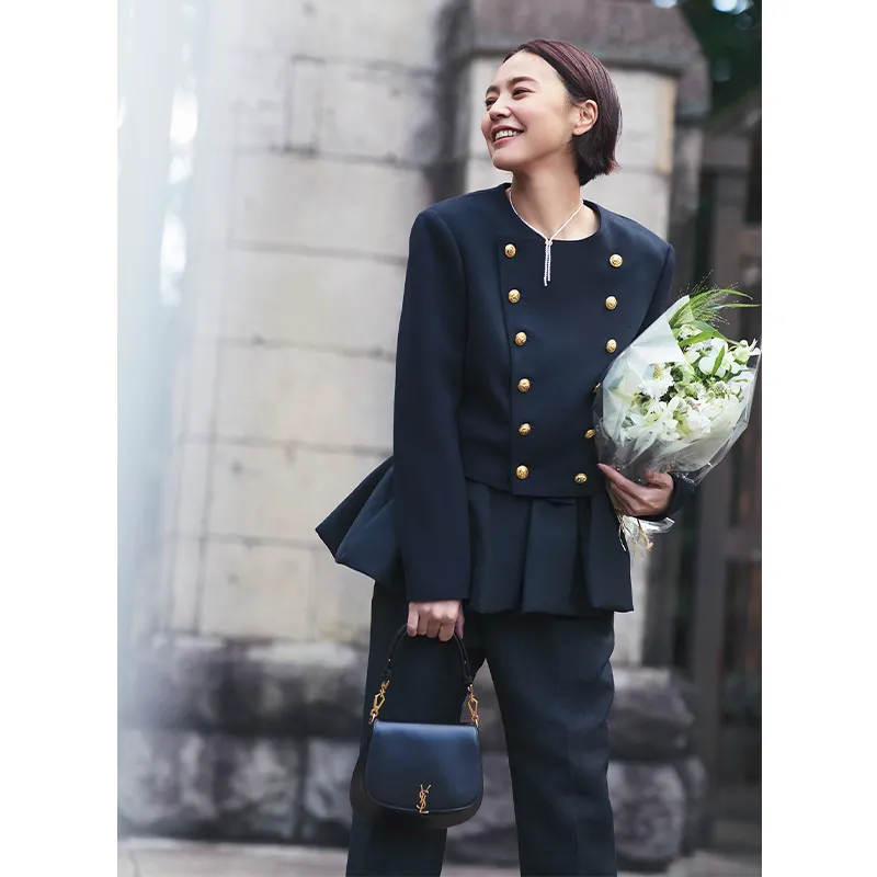 パンツの上に短丈スカートを合わせた技ありペプラムシルエットで、誰とも被らない自分らしいセレモニーコーデに。ナポレオンジャケットの金ボタンとハンドバッグの金具のゴールドがトラッドな雰囲気を醸し、甘い服が苦手な人も着やすい華やかなスタイルが叶います。