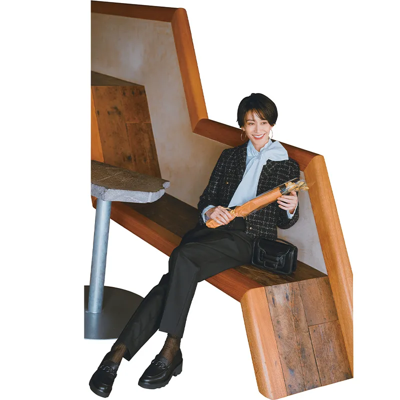 ツイードジャケットに黒パンツの王道セレモニースタイルに、鮮やかなブルーのボウタイブラウスを合わせて顔写りを明るく。足元はローファーでキリッと絞めてトップスの甘さを引き算すると好バランスに。式後は謝恩会へ直行という長丁場の1日をストレスフリーに過ごせるのもポイントです。