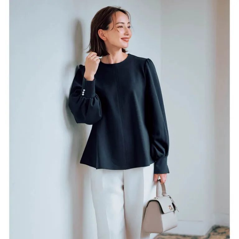 ウエストインしなくても着られるブラウスは40代ママの相棒。きちんと感が保たれる着丈だから、日常使いはもちろん卒園式・卒業式でも活躍。ほどよくボリューム感のある袖と、裾に向かって広がるシルエットが体のラインを拾わず、きれいに着られます。