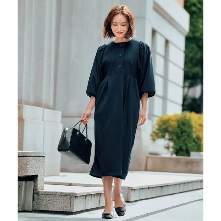 手首を見せる七分丈のボリューム袖と視線を上に集めるハイウエストのワンピースは着やせ効果抜群。スカートはひざ下丈を選べば、脚のシルエットを気にせず着られ、座っても膝が見えないので安心です。