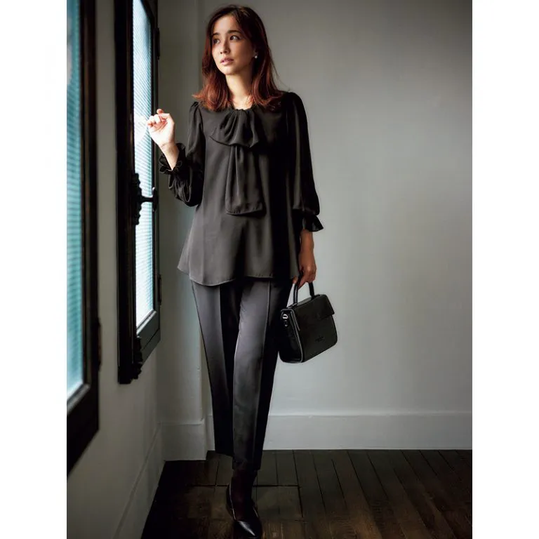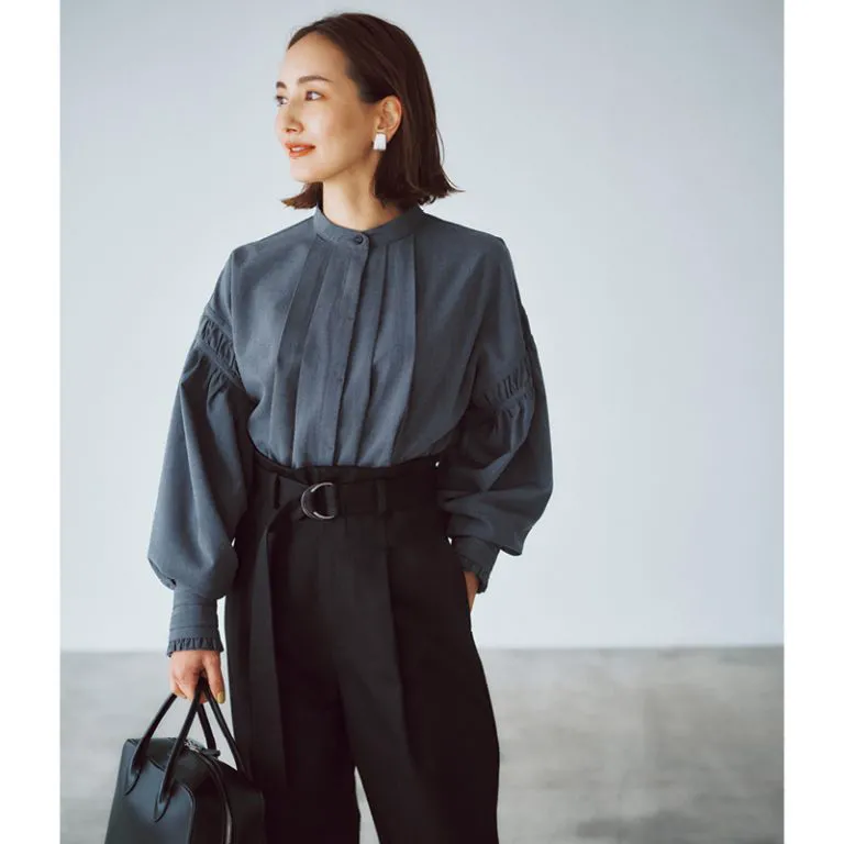 フォーマルなブラウスといえば白か黒。マンネリになりがちなブラウスコーデは、ネイビーをセレクトしてモードな雰囲気に。スタンドカラーを閉じて着て前身頃のタックの効果によりすっきり見せるができます。袖のギャザーやカフスで華やかさも忘れずに。