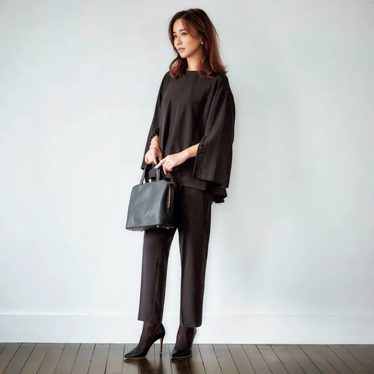 トップスをインするには抵抗がある。そんな40代ママの味方が、トップスをアウトして着られるセットアップスタイル。ウエストから裾に向かってふわっと広がるぺプラムシルエットなら細見え効果も抜群。肉厚素材で首の詰まったデザインを選ぶと、ジャケットなしでもきちんと感が出せます。