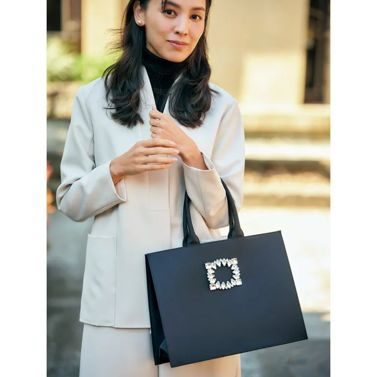 卒園式・卒業式に持っていくなら、光沢のある素材のバッグがおすすめ。特に卒園式の場合は子どもの荷物も多くなりがちなので、容量の大きいタイプならサブバッグいらずで身軽に過ごせます。底板付きで自立するものが着席時や謝恩会の会食シーンで便利。ワンポイントで存在感を放つ大きめビジュー付きのバッグなら、シンプルになりがちな卒園式・卒業式コーデに華を添えてくれます。