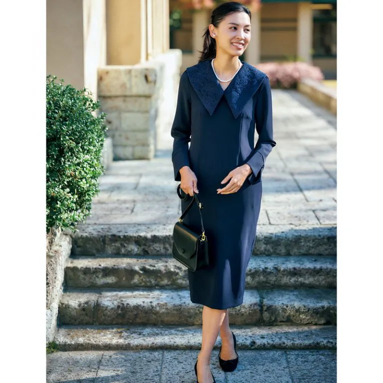 卒園式・卒業式にふさわしいクラシカルな雰囲気のワンピース。シャープで大きな襟が顔まわりを華やかに彩ります。細身に見せるシルエットでありながら、立体的な裁断でゆとりがあるので着痩せ効果も。首まわりはVネックになっていてすっきり。