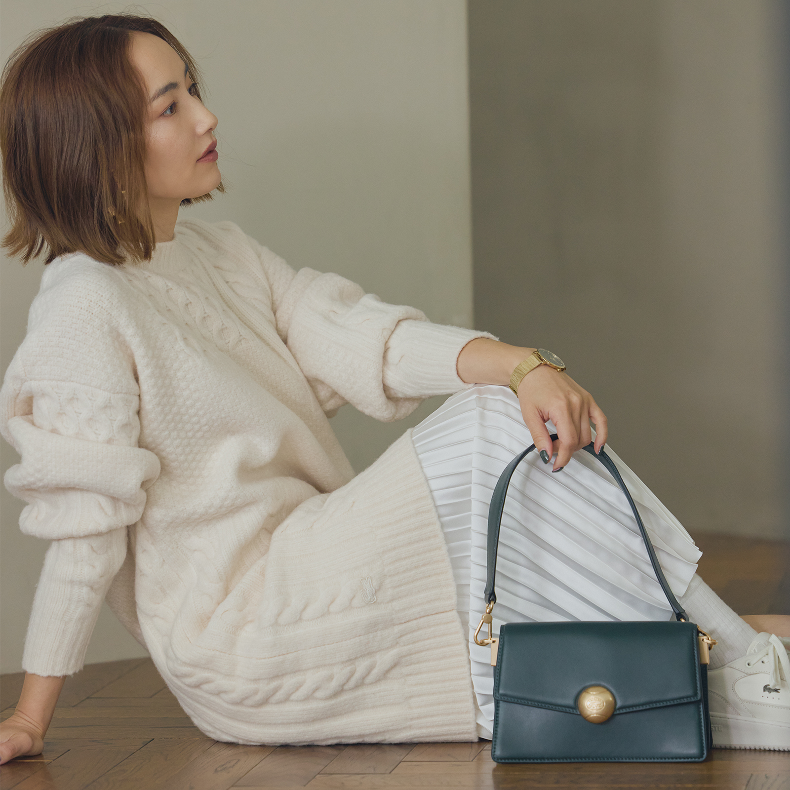 トップス¥19,800(ルル・ウィルビー/アルアバイル)パンツ¥12,100(ミラ オーウェン/ミラオーウェン ルミネ新宿2店)ピアス¥15,070(チビ・ジュエルズ/チビジュエルズ・ジャパン)リング¥10,340(フル・オブ・グレイス/ズットホリック)バッグ¥77,000(ボナベンチュラ)