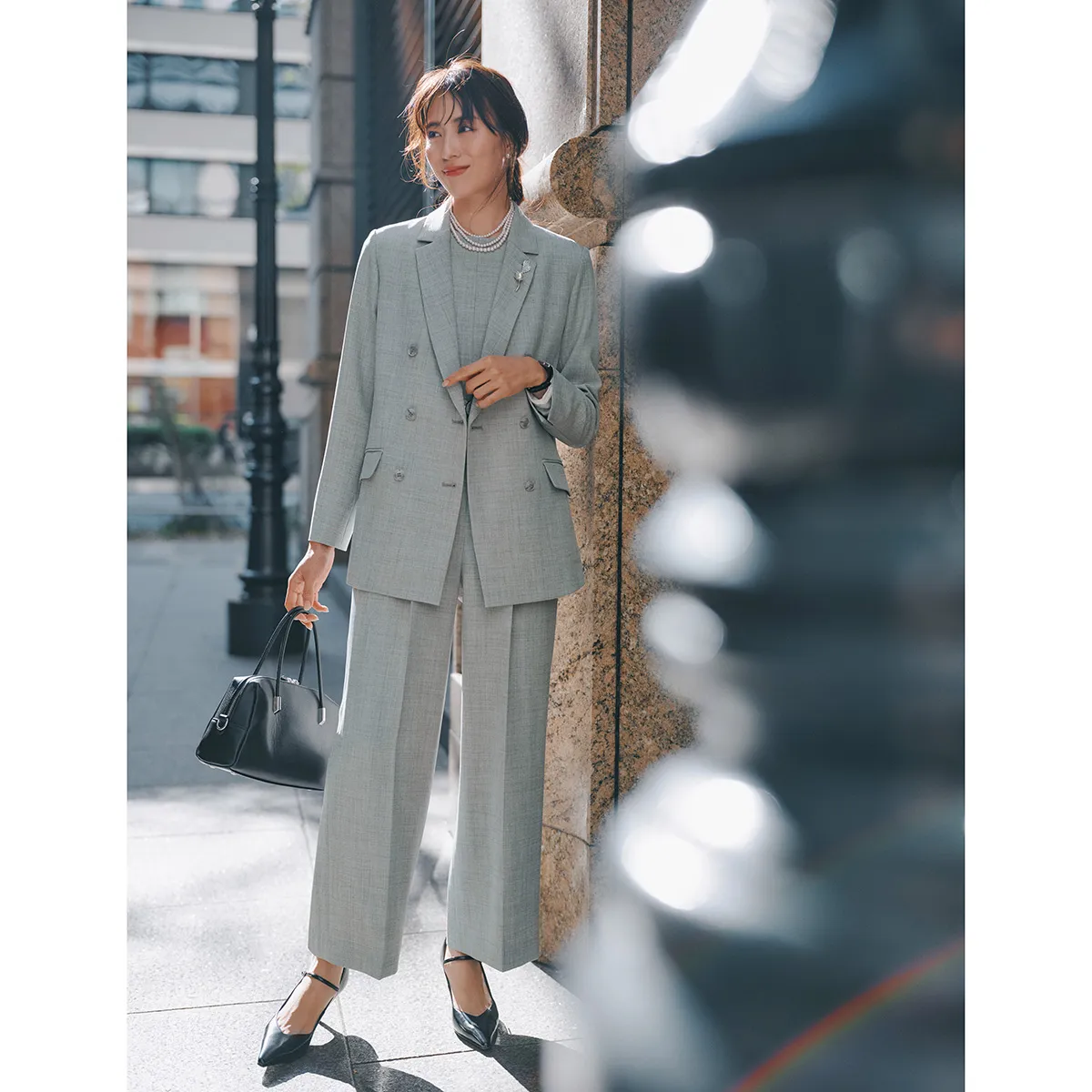 ライトグレーのジャケットとオールインワンのセレモニースーツなら、マニッシュな魅力とエレガンスが融合。杢調で高級感がありつつ普段使いしやすいのがグレーのいいところ。ジャケットはゆとりのあるダブルブレストでウエストやピップ周りの体型カバーも叶います。