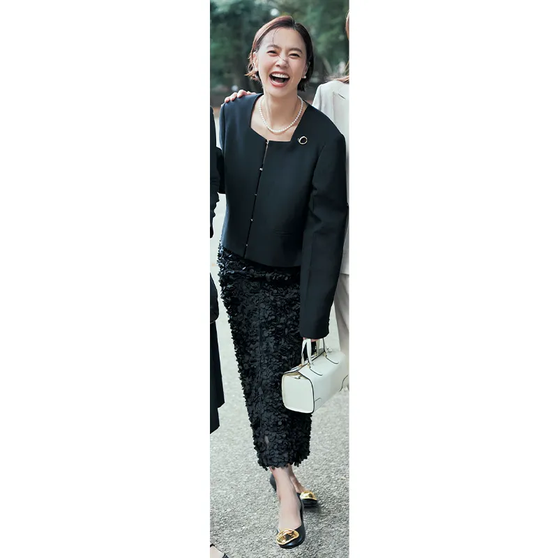 胸元のカッティングがパールネックレスとピアスを引き立てるジャケットのセレモニースーツコーデ。スカートの素材感で華やかさがぐっと高まります。