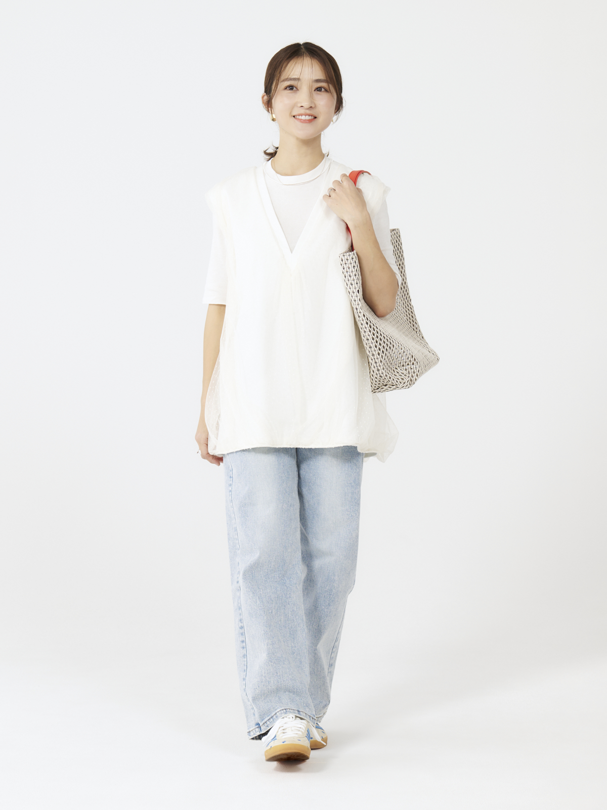 gilet/[THREE SQUARE]チュールベスト T-shirt/H BEAUTY&YOUTH denim pants/ Eaphi bag/MARY AL TERNA shoes/adidas pierced earrings/COS necklace/STELLA HOLLYWOOD