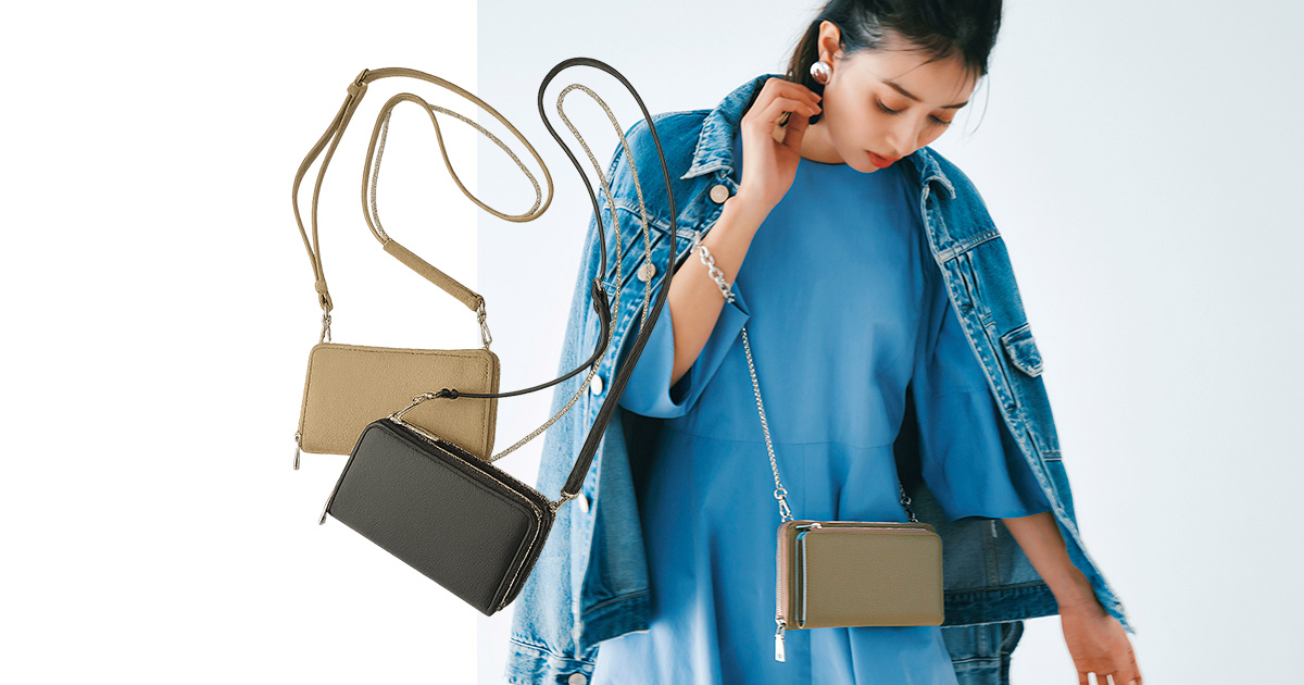 傷が目立ちにくい牛革を使用。前面のポケットにはスマホが入り、本体はラウンドファスナーで大きく開くお財布に。2種類のショルダーが付属。レザーならカジュアルに、チェーンならちょっぴり華やかにと、2本付属したショルダーストラップはその日のコーデや気分に合わせて付け替え可能。
