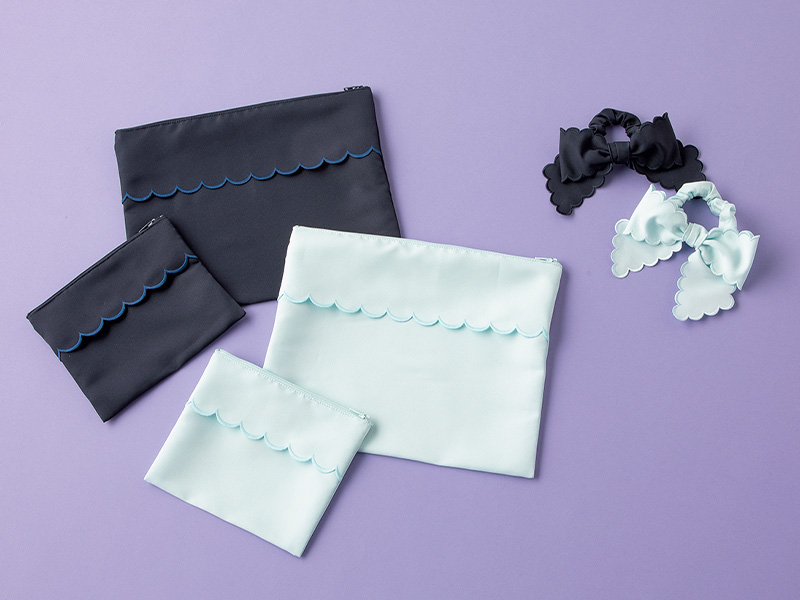 スカラップシュシュ【横約12・ゴム周り約15cm】各¥7,920スカラップポーチセット【small:縦約13.5×横約16.5cm/large:縦約21×横約26.5cm】各¥14,300(すべてマーロンエノンフィ)