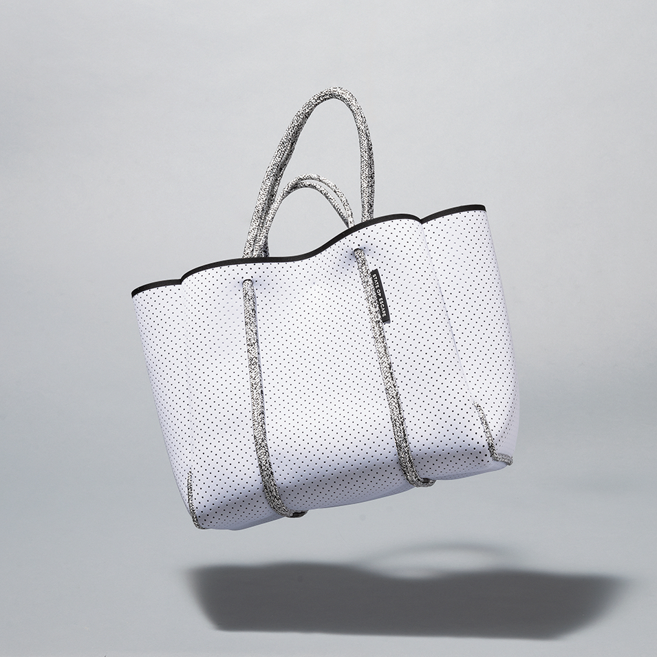 ママバッグとしても人気のステート オブ エスケープトートのネオプレン素材バッグ。こちらはコンパクトながらしっかり入るサイズ感。モノトーンの中にダブルハンドルのグレーがアクセントに。